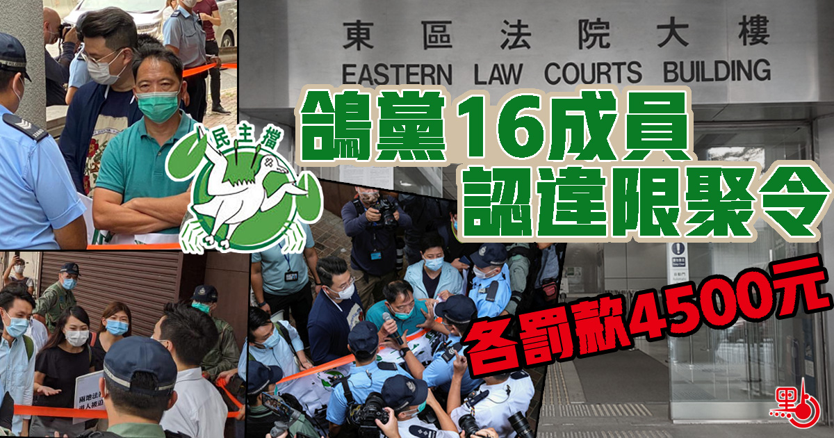 民主黨16名成員去年5月22日遊行至中聯辦反對香港國安法,警方期間共發出三次警告,要求各人解散及離開均不果,最終各人被票控違反當時的8人限聚令。案件昨日原定在東區法院預審,各被告認罪,結果每人判罰4,500港元。