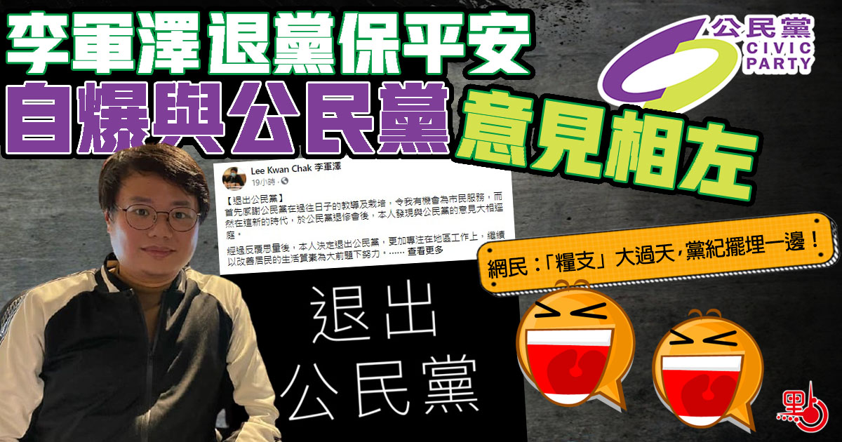 公民黨近期湧現 「割席潮」,近期出逃加拿大的郭榮鏗 就在昨天遞交了退黨申請。原來昨天不僅郭榮鏗 「割席」,同為觀塘區議員的李軍澤亦宣布退出公民黨。李軍澤噚日就喺 fb 發帖話,在這新的時代,自從參與黨內退修會後,發現自己同該黨意見「大相逕庭」,經過反覆思量後決定專注地區工作,即日起退出公民黨。