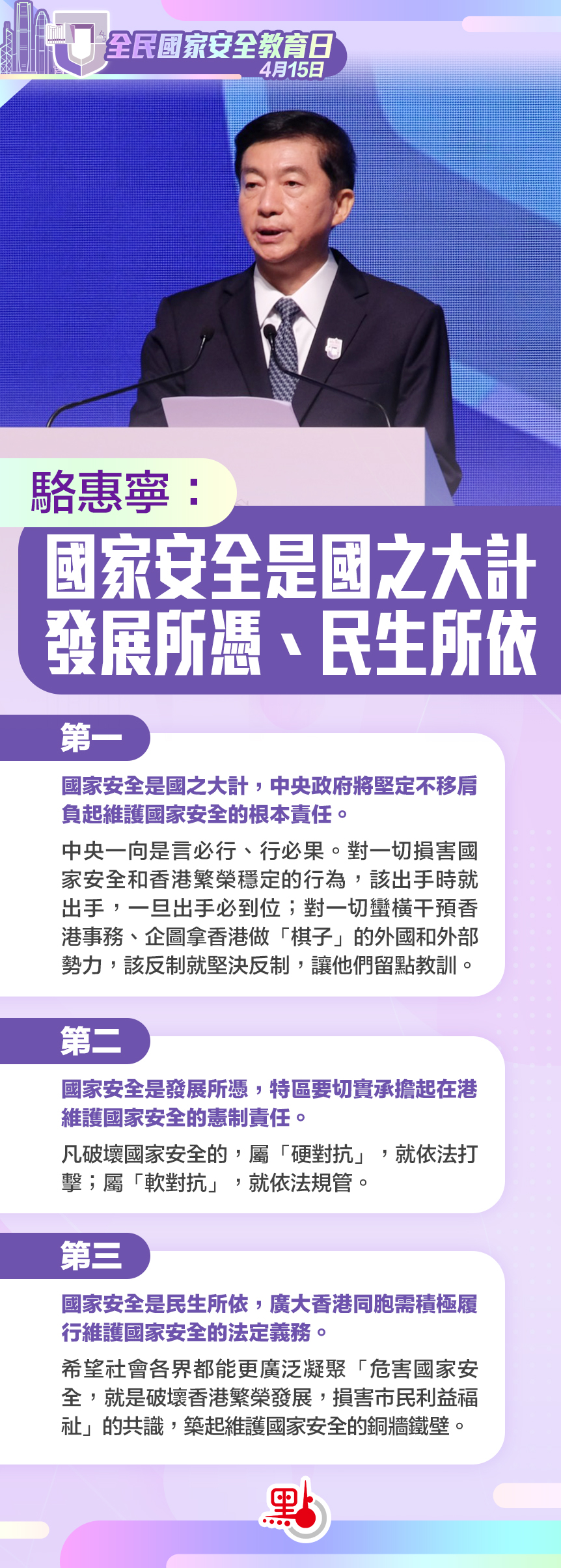 今日(15日)是我國第六個「全民國家安全教育日」,亦是香港國安法實施後的首個「全民國家安全教育日」。香港中聯辦主任、香港特區國安委國家安全事務顧問駱惠寧在特區國安委舉辦的「全民國家安全教育日2021」開幕典禮上致辭時圍繞維護國家安全,分享三點看法。