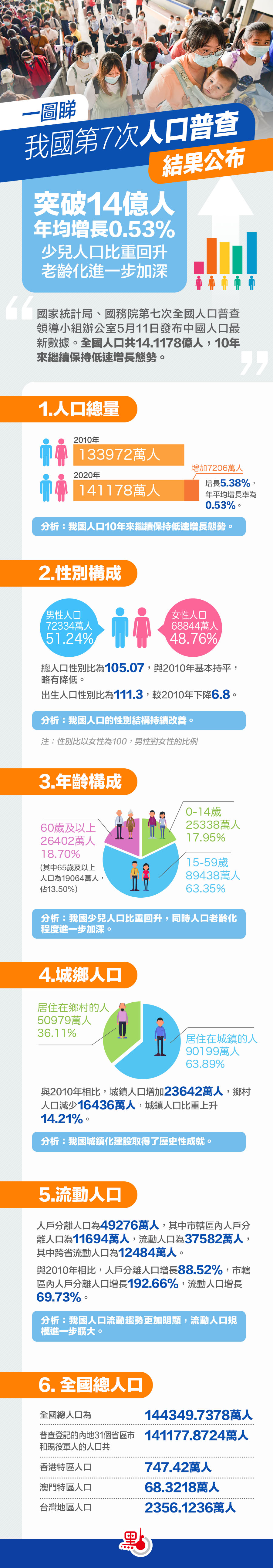 國家統計局、國務院第七次全國人口普查領導小組辦公室今日(11日)發布中國人口最新數據。這次人口普查登記的全國人口為141178萬人,與2010年第六次全國人口普查數據的133972萬人相比,增加7206萬人,增長5.38%,年平均增長率為0.53%,10年來繼續保持低速增長態勢。全國人口性別構成有何變化?年齡構成有何變化?流動人口趨勢有何變化?快來睇下!