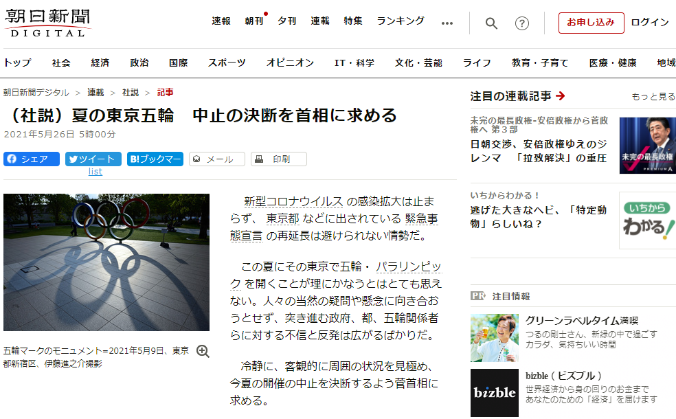 日本東京奧運的官方合作伙伴《朝日新聞》,今日(26日)在社論公開呼籲取消東京奧運。