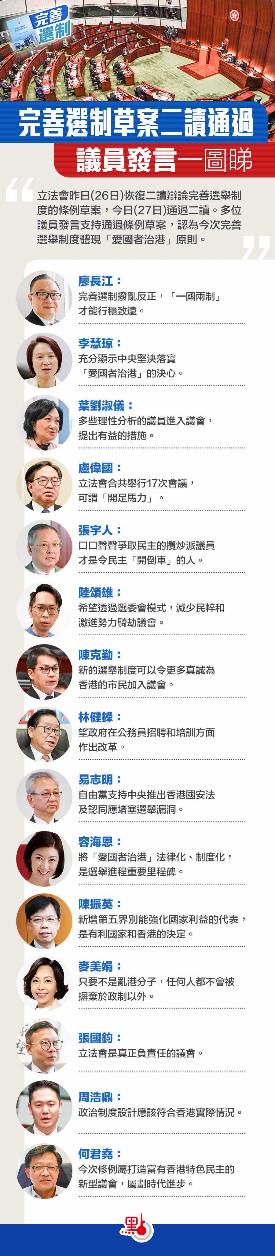 立法會昨日(26日)恢復二讀辯論完善選舉制度的條例草案,今日(27日)通過二讀。多位議員發言支持通過條例草案,認為今次完善選舉制度體現「愛國者治港」原則。