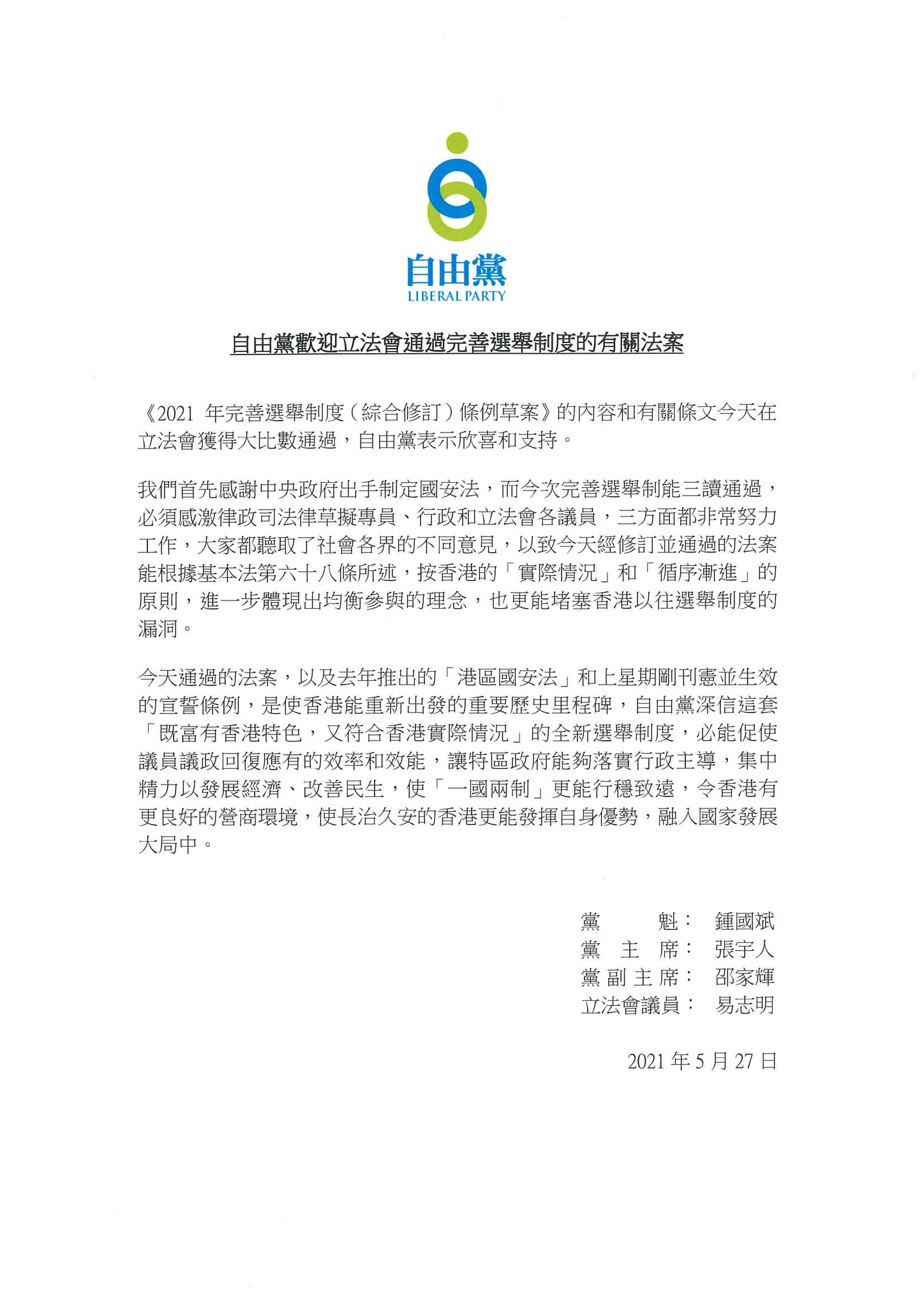 《2021 年完善選舉制度(綜合修訂)條例草案》的內容和有關條文今天(27日)在立法會獲得大比數通過,自由黨表示欣喜和支持。