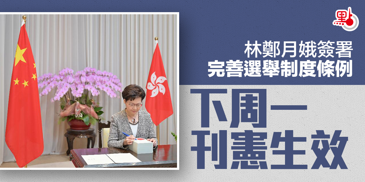 林鄭月娥簽署完善選舉制度條例 下周一刊憲生效
