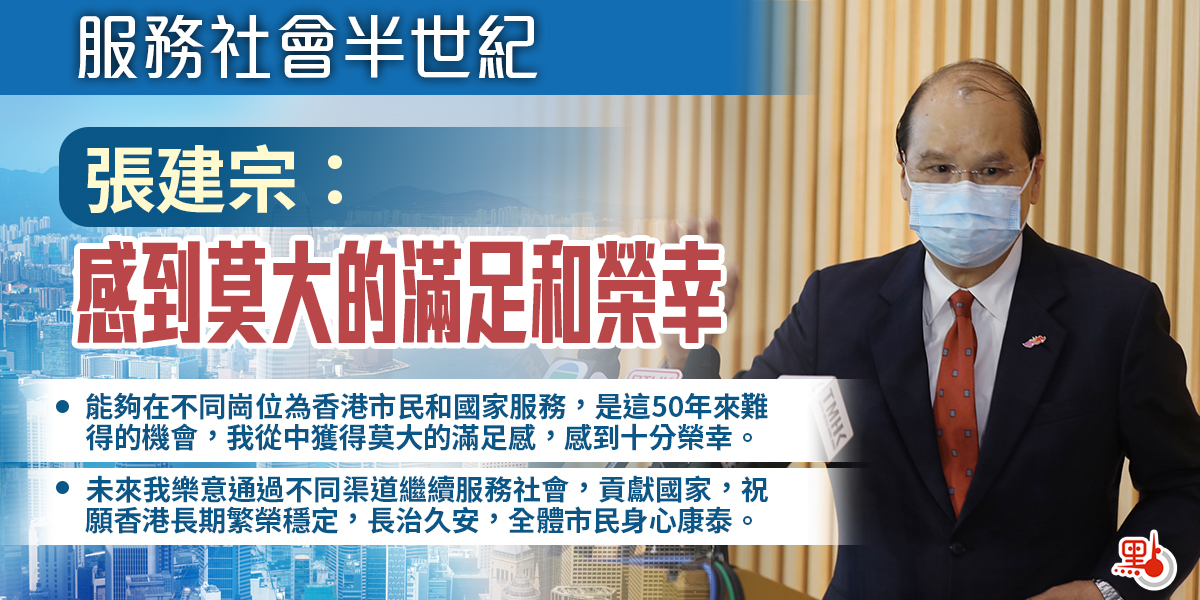 張建宗最後說,未來樂意通過不同渠道繼續服務社會,貢獻國家,他並祝願香港長期繁榮穩定,長治久安,全體市民身心康泰。