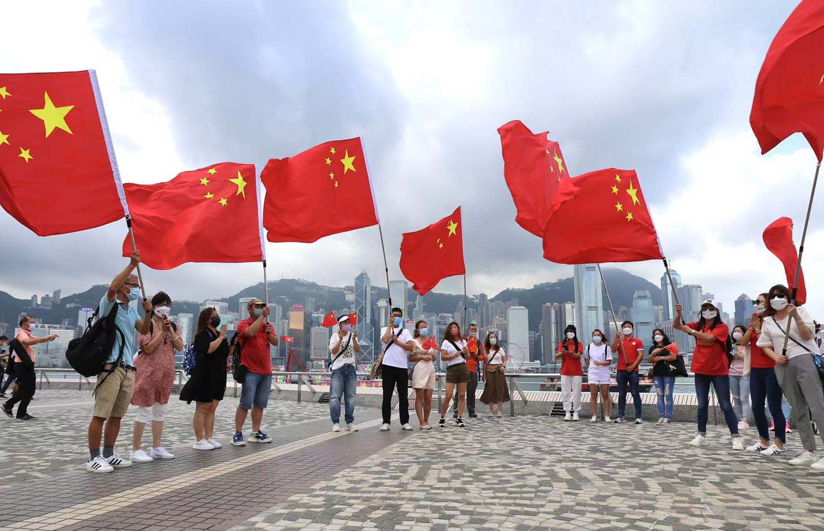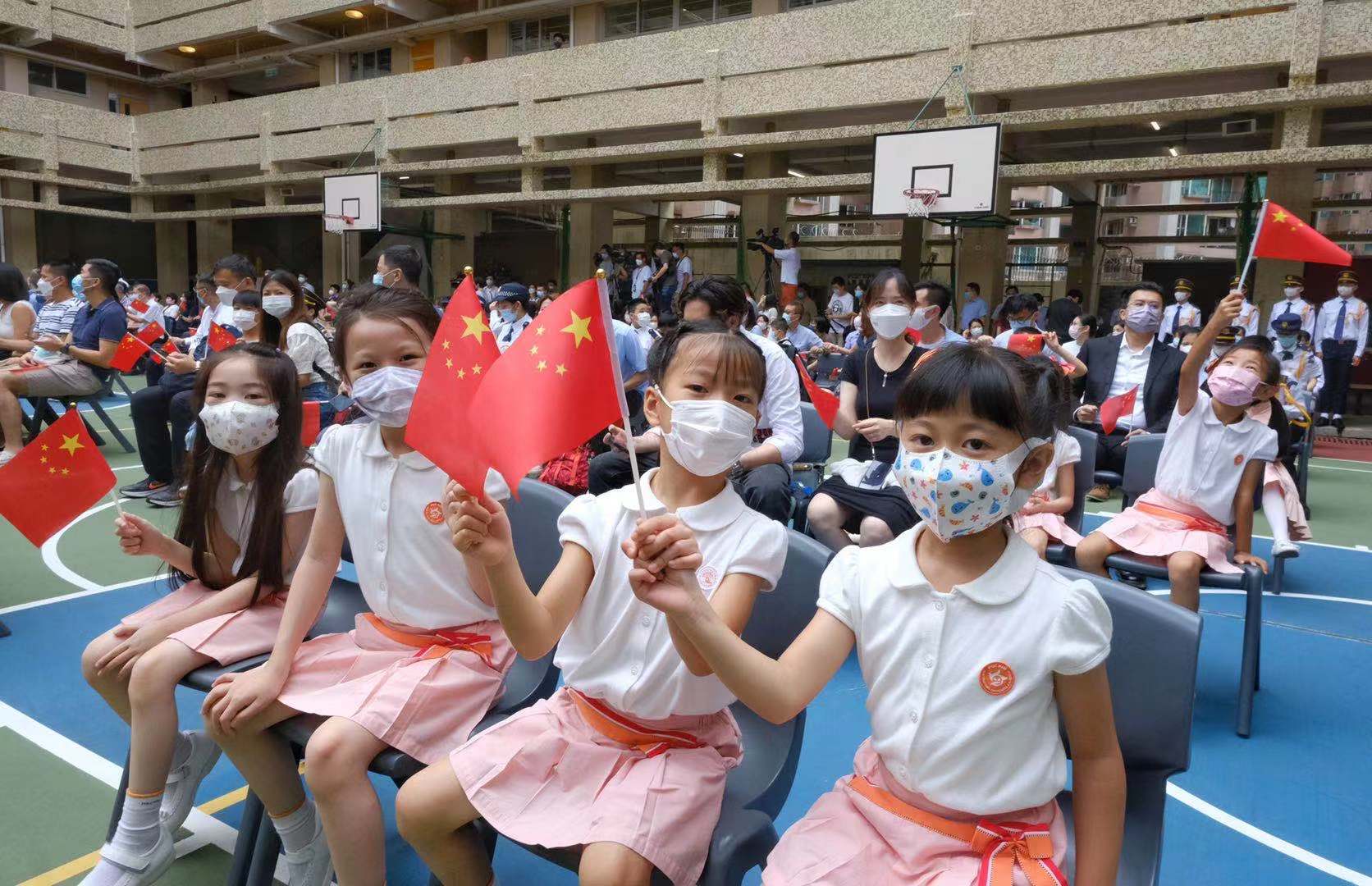 多個香港的中小學在「七一」早晨舉行了升旗儀式,手拿國旗、區旗的孩子們笑得非常開心。同樣的笑容還出現在中環、尖沙咀、旺角、屯門、銅鑼灣……人們拿着國旗區旗在街頭合影,臉上笑意盈盈。