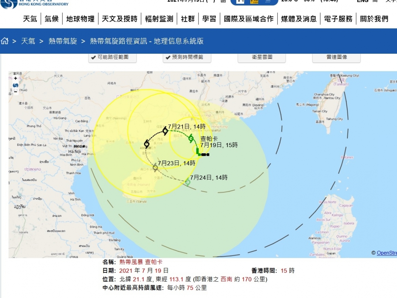【16:55】天文台表示,過去數小時,「查帕卡」緩慢向偏北方向移動,會逐漸靠近廣東西部沿岸,珠江口一帶的風力於今晚至明早會有所增強。預料三號強風信號會維持一段時間。「查帕卡」的路徑及強度變化仍存在變數,天文台會密切監測其動向和發展。另外,與「查帕卡」相關的雨帶會在今晚及明日間中為本港帶來大驟雨及狂風。