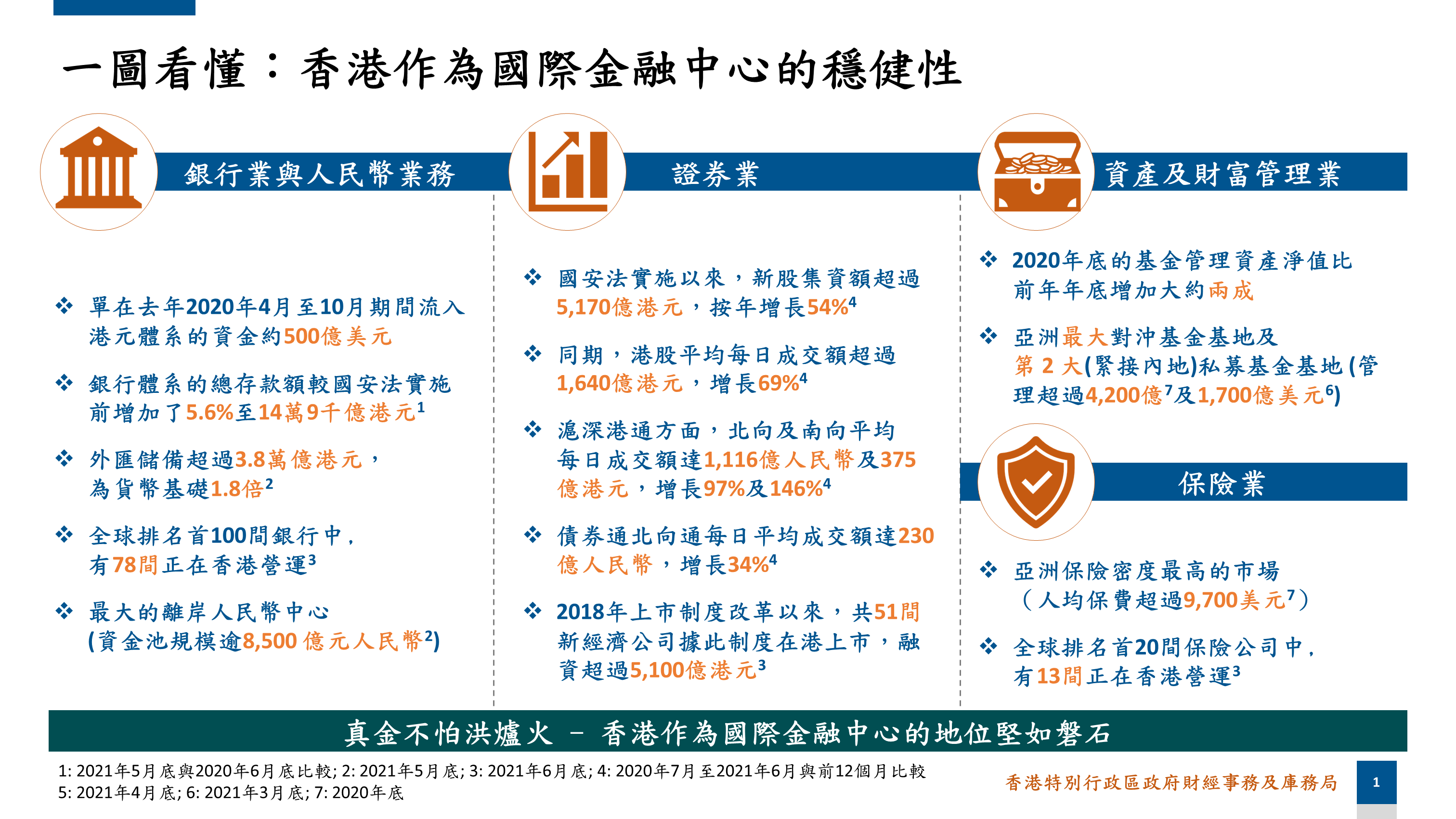 許正宇指出,真金不怕洪爐火,實實在在的關鍵數據與可助大家洞悉真相,了解到香港作為國際金融中心地位堅如磐石的實況。首先,香港有穩健基礎吸引資金流入。港元匯率自2020年年初以來保持強勢,單在去年4月至10月期間觸發強方兌換保証流入港元體系的資金總額約500億美元,當中7月1日後流入的佔420億美元。目前香港擁有的外匯儲備超過3.8萬億港元,為港元貨幣基礎的1.8倍。