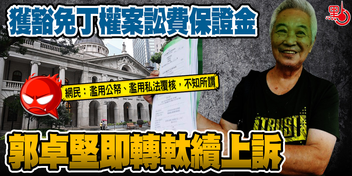 「長洲覆核狂」郭卓堅上周喺fb呻窮,話無人願意贊助佢,決定放棄就丁權案提出的終審上訴。以為事件告一段落,點知,終審法院昨日頒下判辭,豁免郭卓堅支付480萬訟費保證金,郭隨即轉軚表示會繼續上訴。