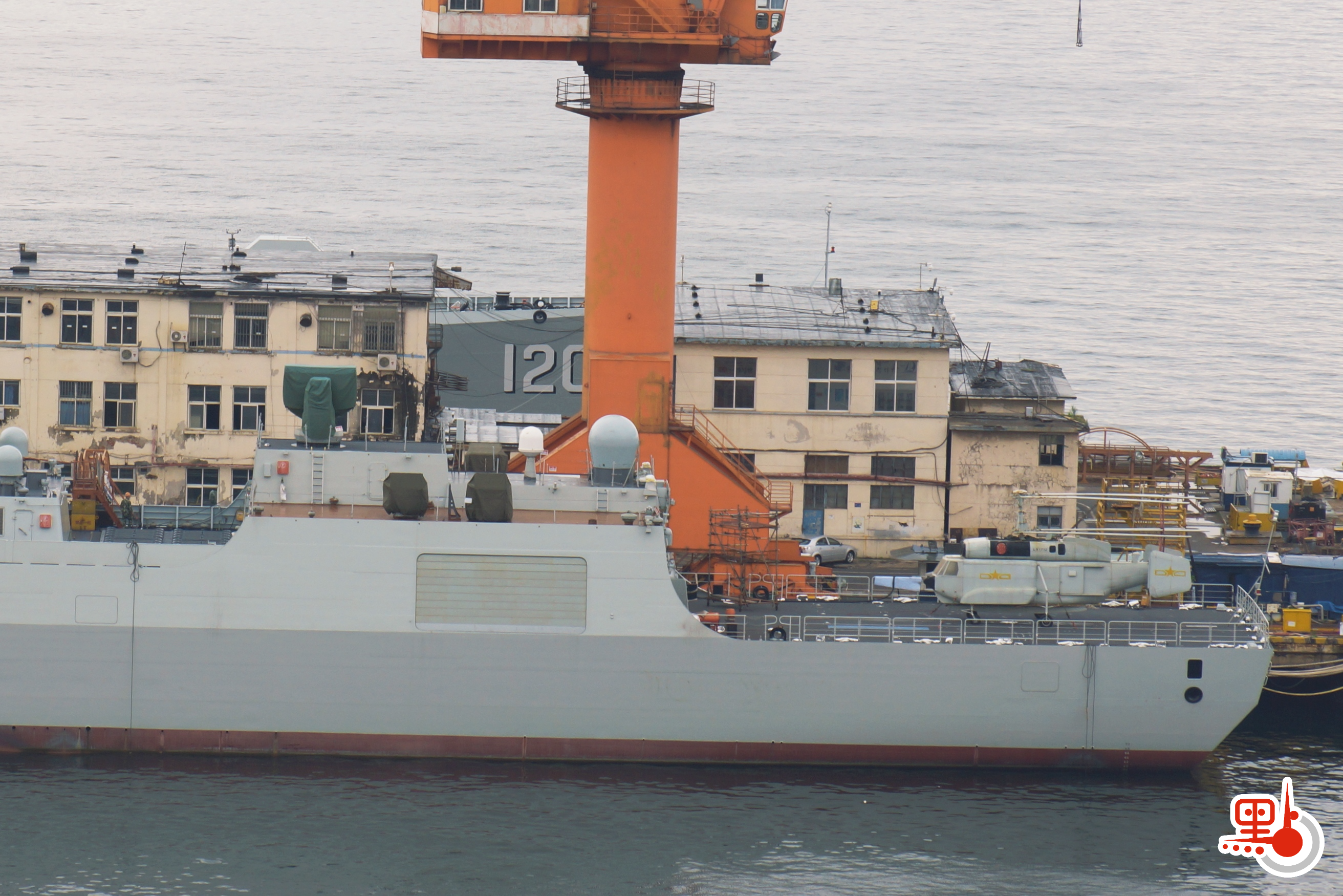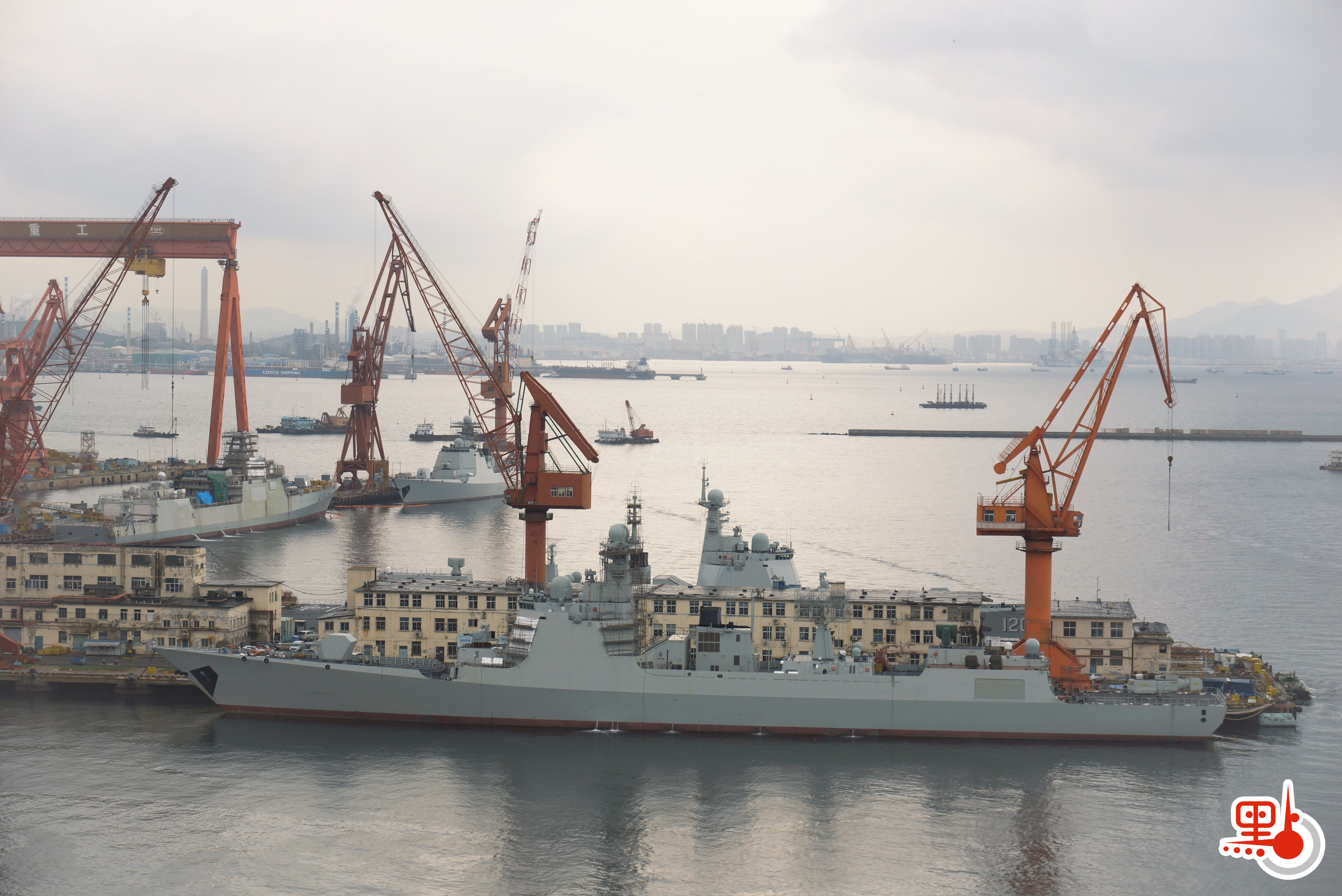 在大連造船廠,隸屬北海艦隊的052D型導彈驅逐艦成都艦(舷號120)與正在舾裝的一艘055型和兩艘052DG型導彈驅逐艦同框。