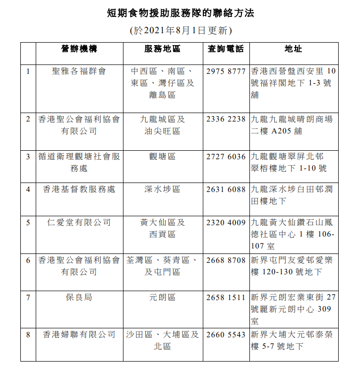 短期食物援助恒常化 營辦機構及服務地域更新(附聯絡資訊)