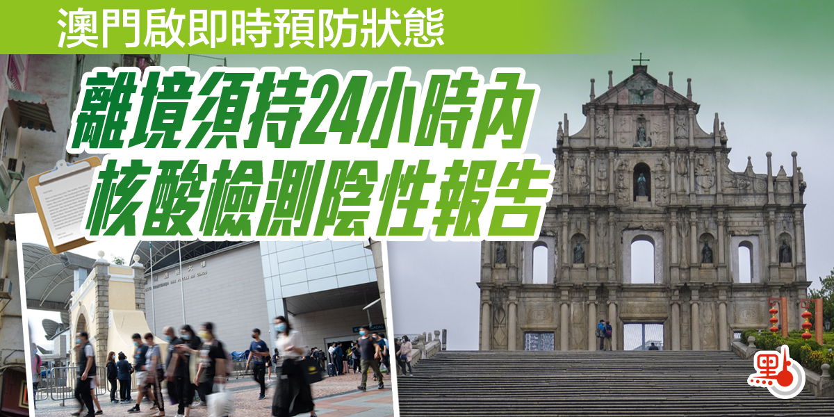 澳門啟即時預防狀態 離境須持24小時內核酸檢測陰性報告
