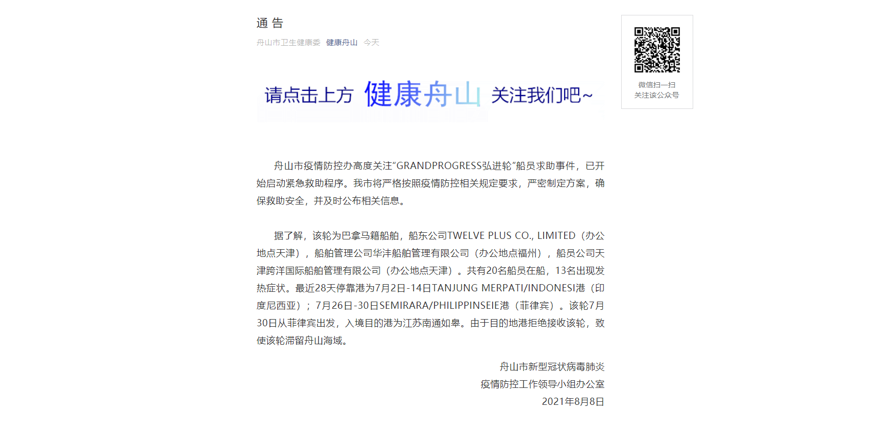 8月8日,一位自稱「郭玉強」的水手在社交平台求助的信息得到廣泛傳播。該水手稱,船上共有13位船員出現了發熱症狀,「船員病情加重,全身無力,船舶無法再繼續航行」,於是向政府和海事部門求助。交通運輸部相關負責人今日(8日)回應點新聞記者,表示已經進行處置,目前天津和浙江地方政府都在行動。舟山市新型冠狀病毒肺炎疫情防控工作領導小組辦公室同日發布通告,稱舟山市疫情防控辦高度關注船員求助事件,已開始啟動緊急救助程序。