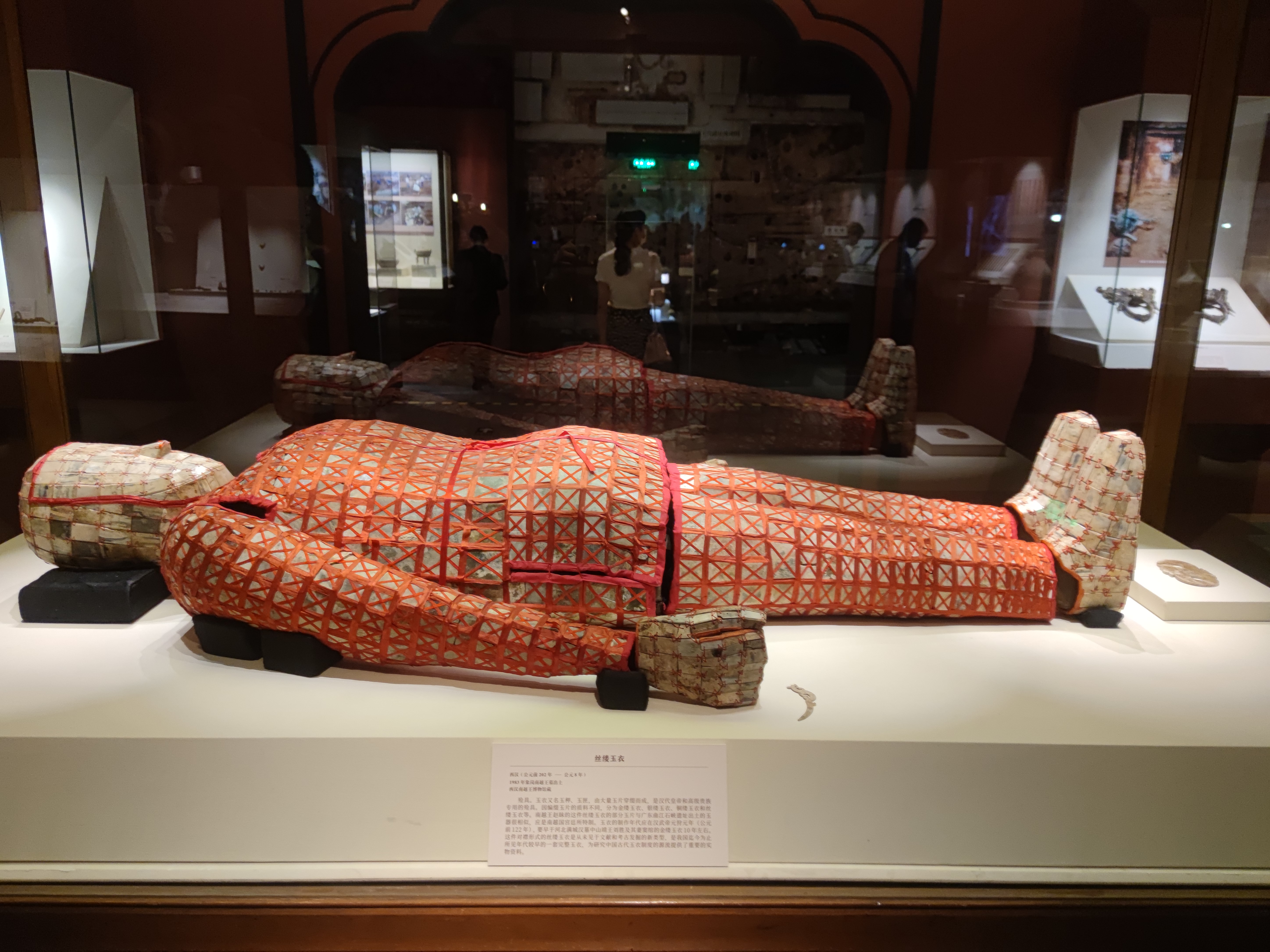 展覽策展人翟勝利重點推薦了一件1983年象崗南越王墓出土的絲縷玉衣。絲縷玉衣是南越王趙眛的殮裝,長1.73米,共用了2291片玉,是目前考古出土的唯一一件絲縷玉衣。玉衣又名玉柙、玉匣,由大量玉片穿綴而成,是漢代皇帝和高級貴族專用的殮具。南越王趙眛的這件絲縷玉衣的製作年代應在漢武帝元狩元年(公元前122年),要早於河北滿城漢墓中山靖王劉勝及其妻竇綰的金縷玉衣10年左右。翟勝利表示,這件對襟形式的絲縷玉衣是從未見於文獻和考古發掘的新類型,是中國迄今為止所見年代較早的一套完整玉衣,為研究中國古代玉衣制度的源流提供了重要的實物資料。