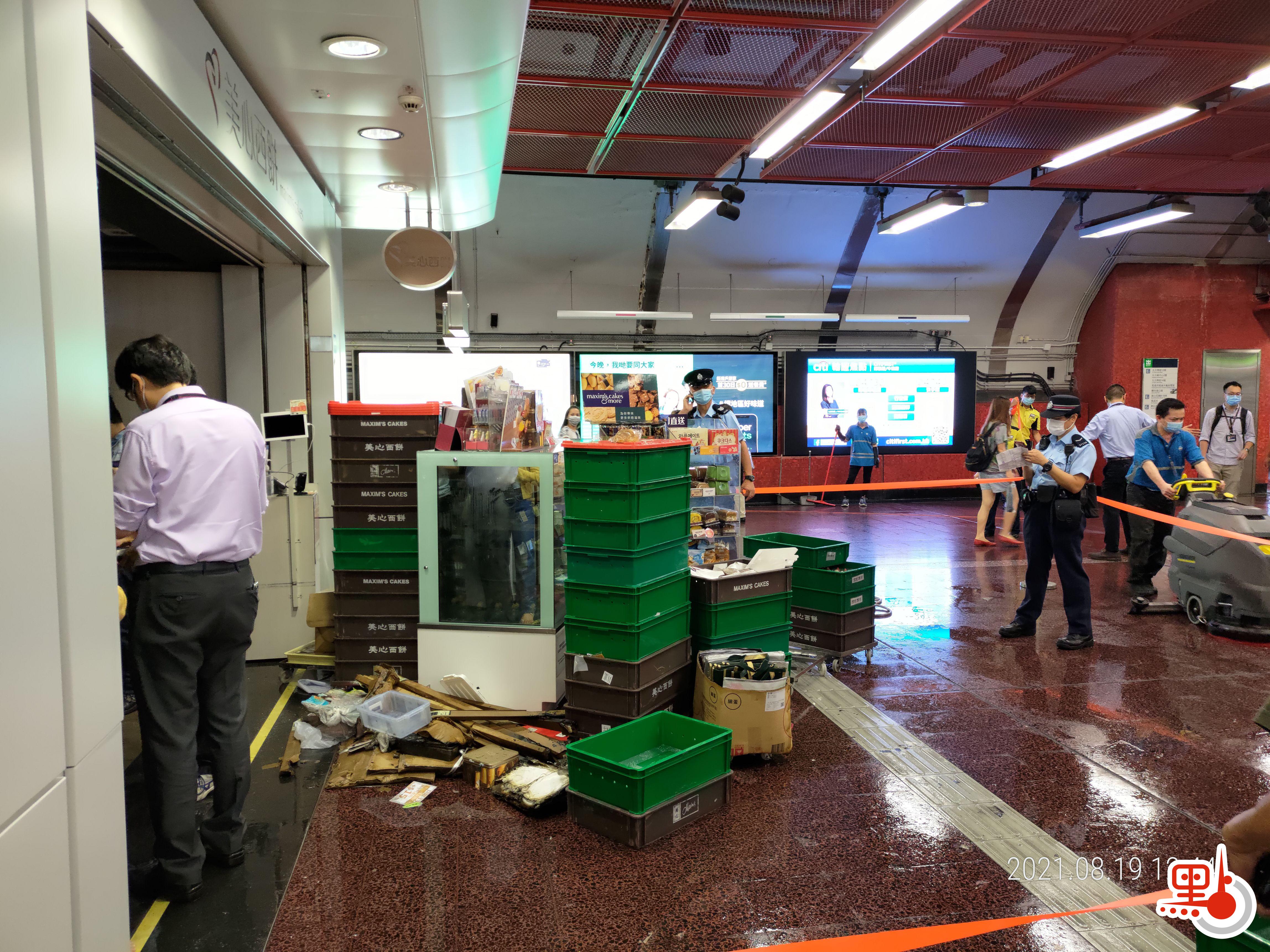 今日(19日)上午11時許,港鐵港島綫太古站大堂的美心西餅門市,懷疑電線短路冒煙,並觸及自動灑水系統噴灑。消防到場處理,有警員在現場拉起警戒線。另外,大堂及部分月台有積水,令不少乘客要在濕滑地面行走,有港鐵職員隨後進行清理。列車服務不受影響。