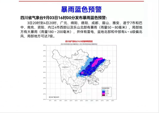 昨天(3日)下午5時至今早7時,樂山暴雨到大暴雨個別地方特大暴雨;廣元、眉山2市大部,巴中、南充2市西部,德陽、綿陽2市東部,遂寧北部,成都東部及西北部,雅安中部大到暴雨局地大暴雨;最大雨量出現在樂山市井研縣東林鎮東光村。