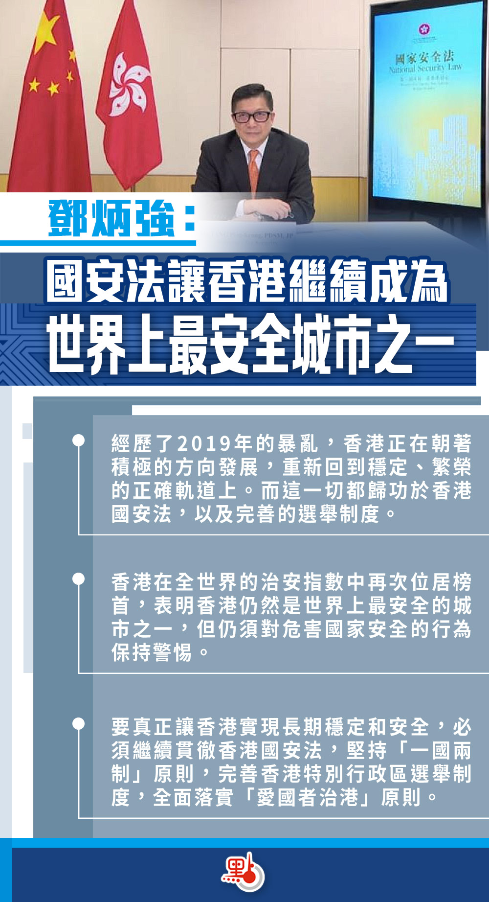 鄧炳強說:「回想起去年國安法落地時,一些國家刻意抹黑國安法,甚至干涉我們要求廢除國安法。更可笑的是,這些國家都有自己的國安法,而且國安法比香港的更嚴格、範圍更廣。我找不到比『雙重標準』更好的詞來描述這些國家了。要真正讓香港實現長期穩定和安全,必須繼續貫徹香港國安法,堅持『一國兩制』原則,完善香港特別行政區選舉制度,全面落實『愛國者治港』原則」。