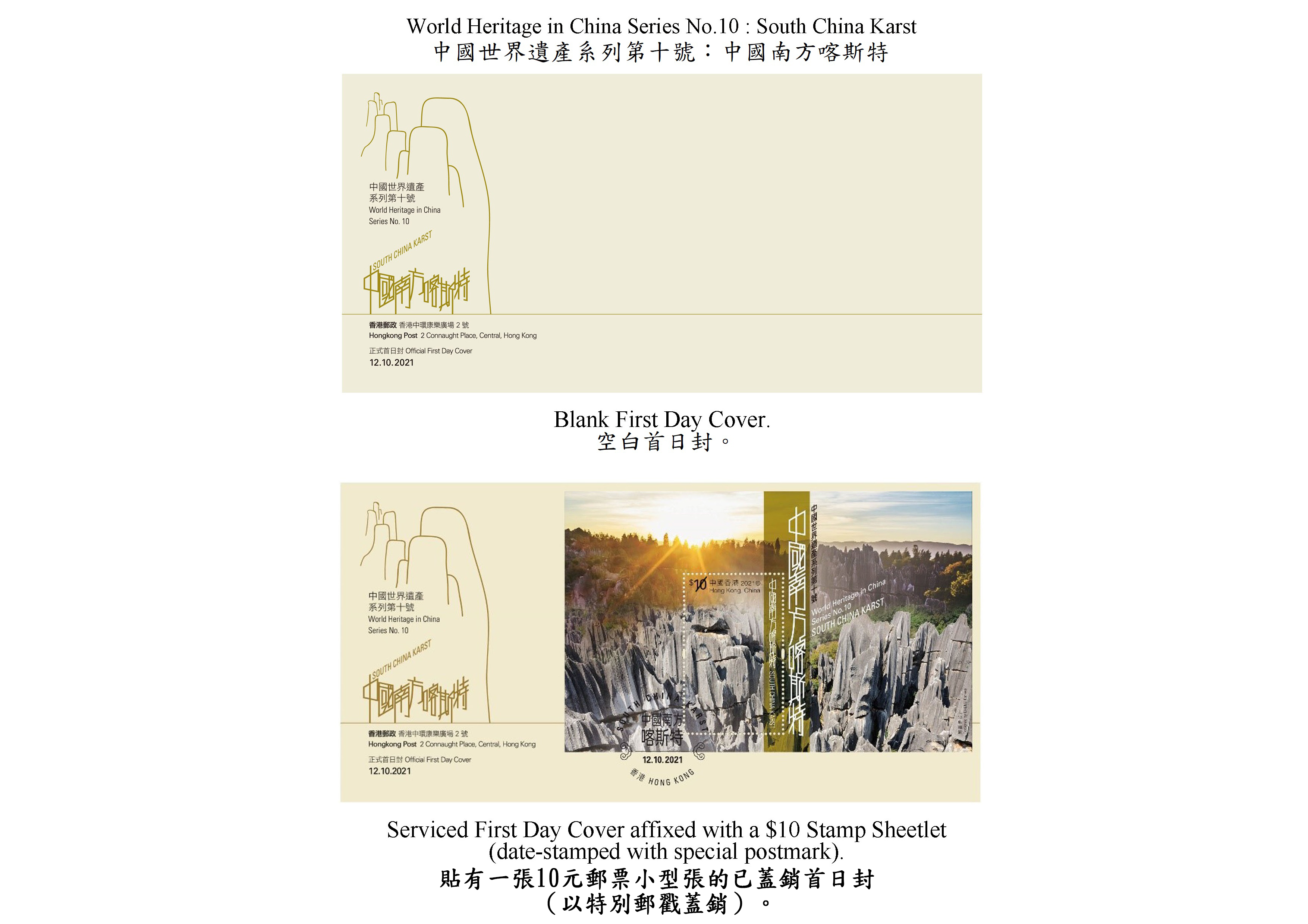 各郵政局將由10月12日起發售「中國世界遺產系列第十號:中國南方喀斯特」和「中國世界遺產全系列」郵票小型張,以及相關郵品(包括套摺和紀念套摺)。已蓋銷首日封和已蓋銷紀念封只限在集郵局發售。