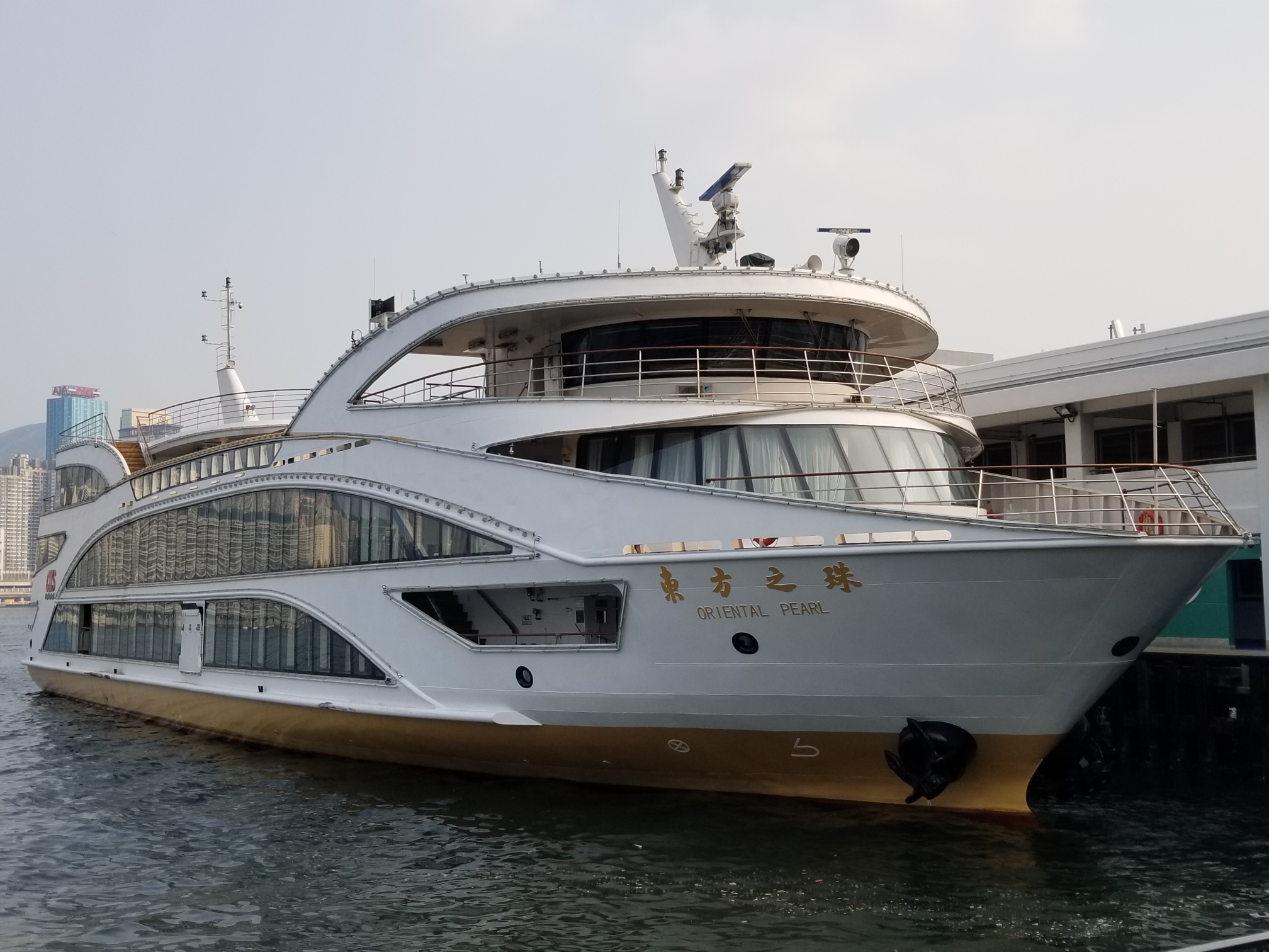 「東方之珠」號,定位為大型觀光遊船,長64米、闊14.5米,高4層,可載客486人,船上特色包括設有特大露天舺板,內設宴會大廳及VIP房等。雖然宴會廳可提供自助餐,但船公司表明現時疫情未止,暫時不會提供自助餐。