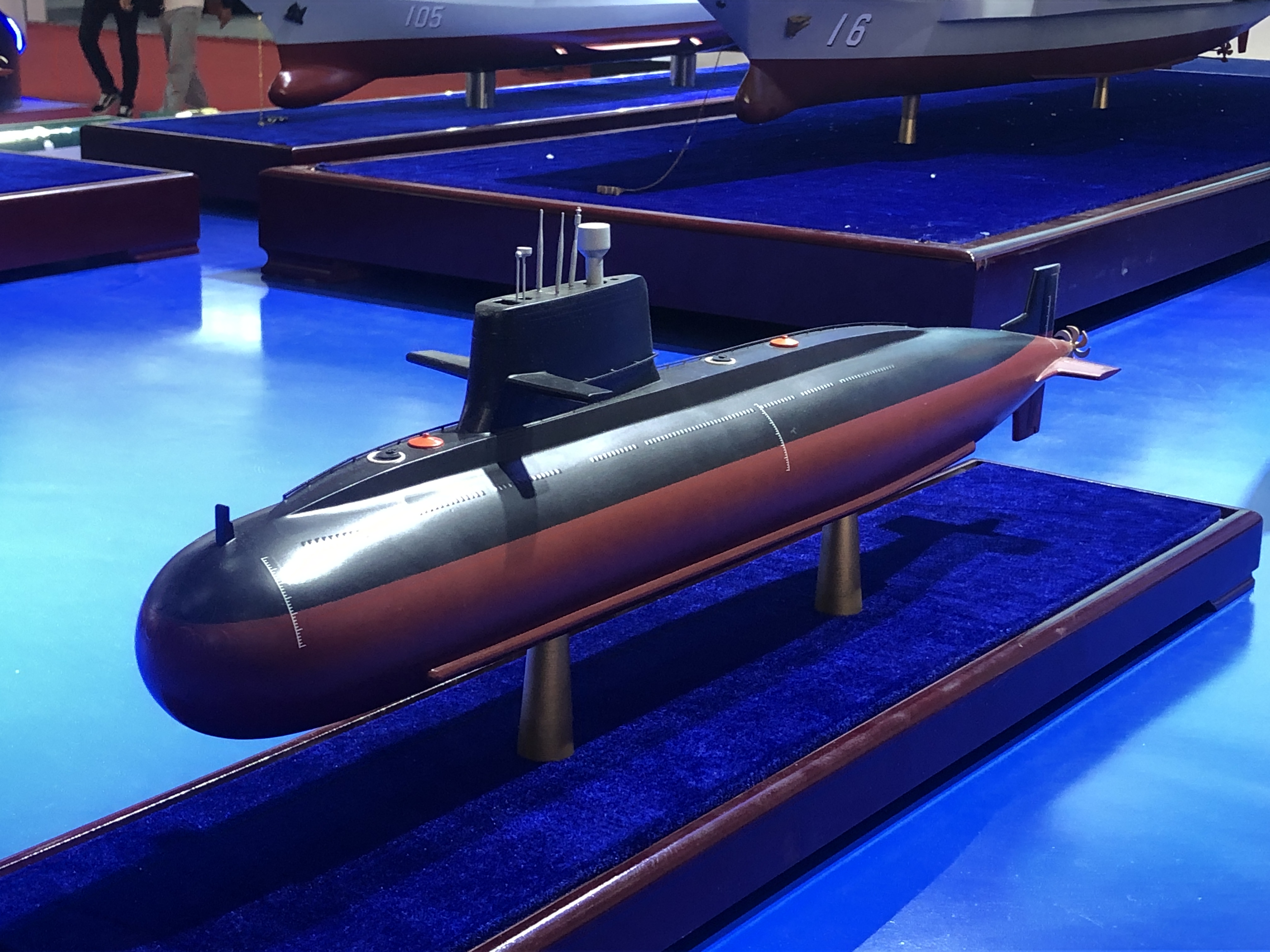 一直披着神秘面紗的中國戰略導彈核潛艇經常成為外界討論的話題。記者在航展現場看到,中國船舶集團將航母模型與其他軍艦模型一併展示的同時,也首次向外界展示了核潛艇,讓觀眾一飽眼福。