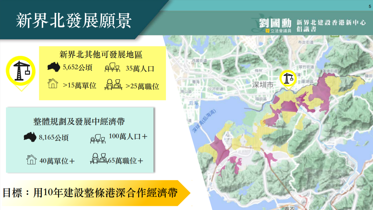 特別在基建方面,劉國勳指出,過去新界北的發展策略包括《鐵路發展策略2014》、《跨越2030年的鐵路及主要幹道策略性研究》等都提及新界北的鐵路基建,不過大多「只聞樓梯響」,而為了要解決香港住房問題,幫助香港轉型,就必須在新界北發展新中心,以「基建先行」的模式,大力發展房屋、商業、創科產業。