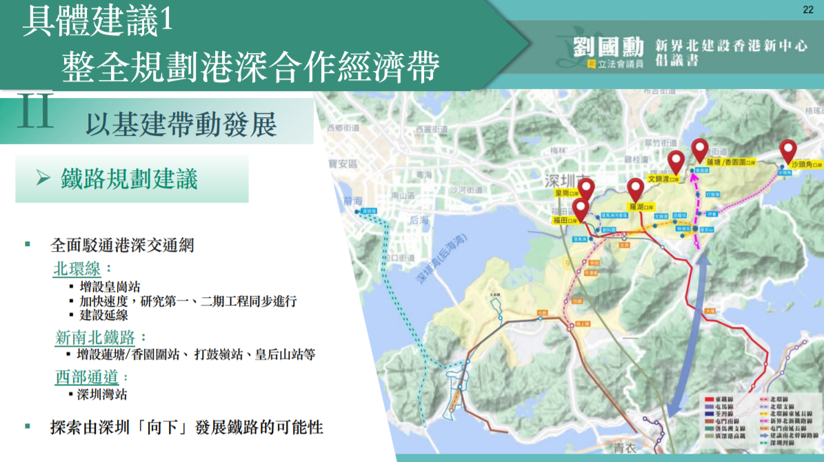 至於新界北連接前海新鐵路線的規劃,政府規劃方案中的洪水橋站將於2024年動工、2030年竣工,劉國勳敦促政府加快洪水橋站建設,將前海至洪水橋新鐵路與洪水橋站同步建設,於2030年前啟用。劉國勳還提到,在興建前海至洪水橋跨境鐵路之前,建議由兩地政府商討由誰負責興建,並可進一步探討由深圳先行、抑或由香港起動。