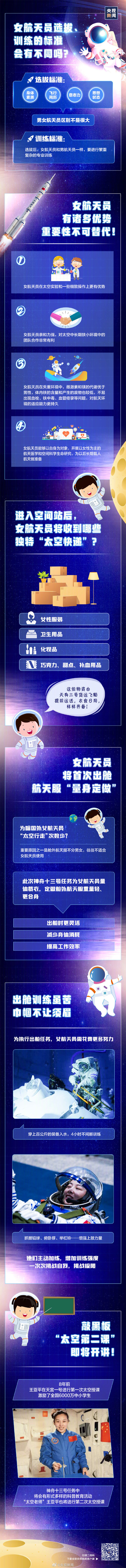 神舟十三號發射圓滿成功,王亞平成為中國空間站首位女航天員。為迎接女航天員,中國空間站做了哪些準備?女航天員在太空中有哪些優勢?她們的選拔標準、訓練標準又有何不同?一圖可知。
