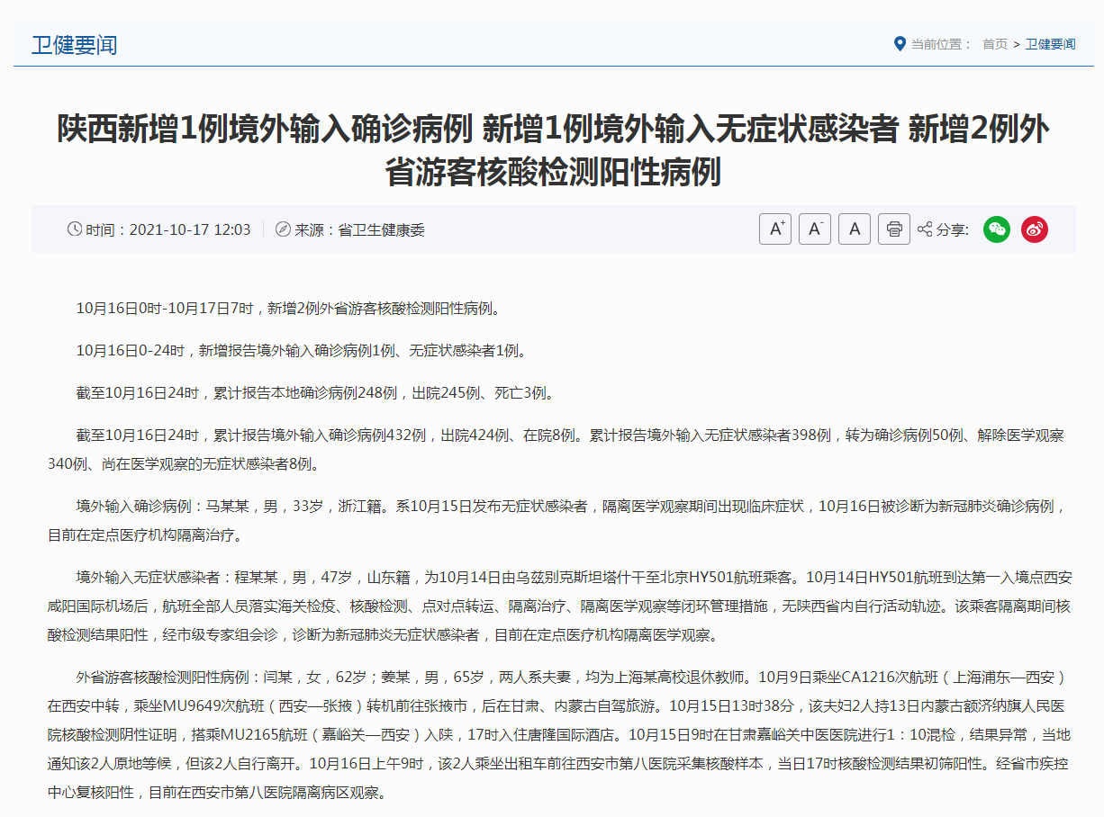 陝西省衞健委公布的行程軌跡顯示,兩人10月9日乘坐CA1216次航班(上海浦東—西安)在西安中轉,乘坐MU9649次航班(西安—張掖)轉機前往張掖市,後在甘肅、內蒙古自駕旅遊。10月15日13時38分,該夫婦2人持13日內蒙古額濟納旗人民醫院核酸檢測陰性證明,搭乘MU2165航班(嘉峪關—西安)入陝,17時入住唐隆國際酒店。10月15日9時在甘肅嘉峪關中醫醫院進行1∶10混檢,結果異常,當地通知該2人原地等候,但該2人自行離開。10月16日上午9時,該2人乘坐的士前往西安市第八醫院採集核酸樣本,當日17時核酸檢測結果初篩陽性。經省市疾控中心覆核陽性,目前在西安市第八醫院隔離病區觀察。