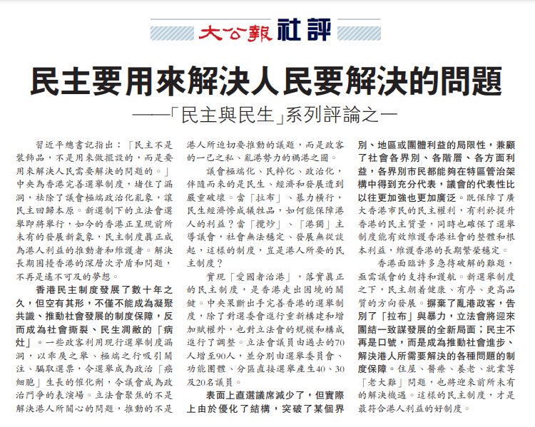 《大公報》今日在A4版刊登題為「民主要用來解決人民要解決的問題」的社評指出,新選制下的立法會選舉即將舉行,如今的香港正呈現前所未有的發展新氣象,民主制度真正成為港人利益的推動者和維護者。解決長期困擾香港的深層次矛盾和問題,不再是遙不可及的夢想。社評認為,實現「愛國者治港」,落實真正的民主制度,是香港走出困境的關鍵。