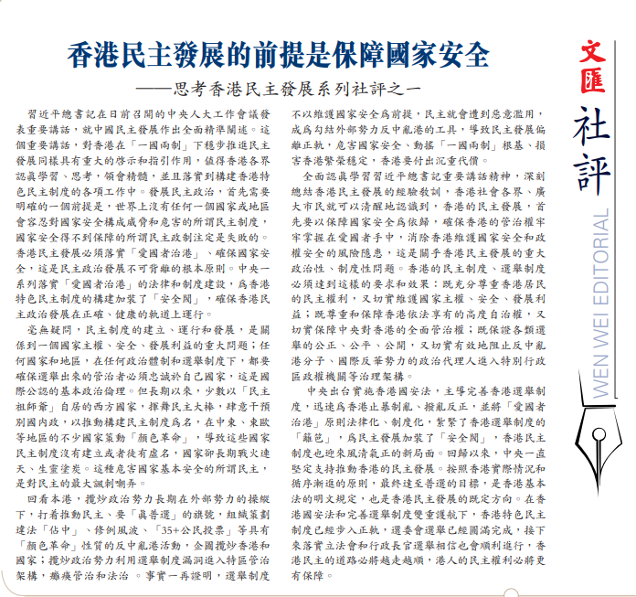 《文匯報》則在A6版發表「香港民主發展的前提是保障國家安全」指,香港民主發展必須落實「愛國者治港」、確保國家安全,這是民主政治發展不可背離的根本原則。《文匯報》社評認為,香港的民主發展,首先要以保障國家安全為依歸,確保香港的管治權牢牢掌握在愛國者手中,消除香港維護國家安全和政權安全的風險隱患,這是關乎香港民主發展的重大政治性、制度性問題。
