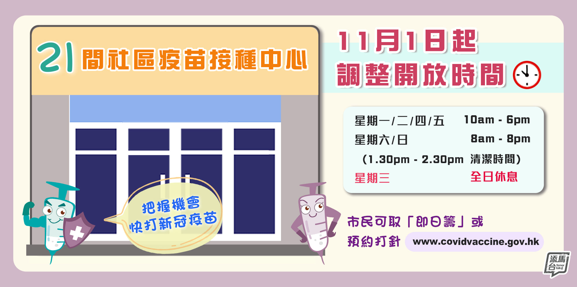 政府早前表示,由11月1日起,社區疫苗接種中心由26間減至21間,服務時間亦有調整,周一至五服務時間為上午10時至下午6時,逢周三全日休息,周六及日則上午8時至晚上8時提供服務。