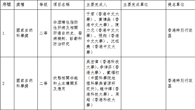 2020年度國家科學技術獎勵大會今日(3日)在北京舉行。香港科研界共獲6項國家科學技術獎,其中香港中文大學于君教授主導的《非酒精性脂肪性肝病及相關肝癌自然史、發病機制、診斷和防治研究》,香港科技大學吳宏偉教授主導的《狀態相關非飽和土本構關係及應用》分別獲得國家自然科學獎二等獎。