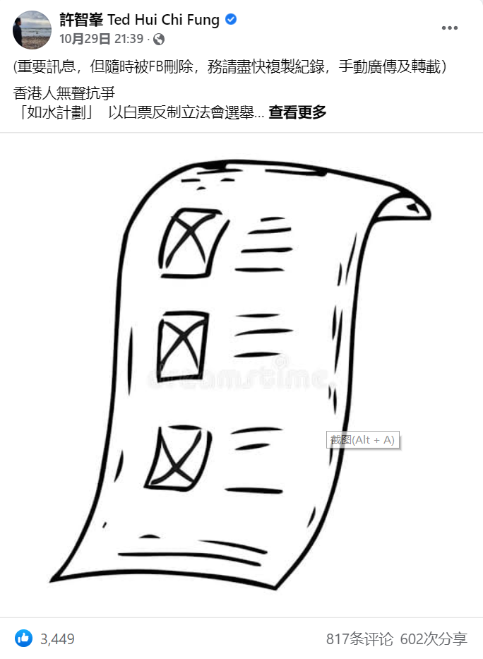 許智峯日前在facebook發文提出所謂的「如水計劃」,煽動市民不投票,企圖煽動一部分人使香港重回2019年區議會選舉時的混亂情況。而丘文俊則在facebook上污衊完善選舉制度是「禁絕有任何異見及反對聲音」,聲稱2019年黑暴是為了民主和自由,又煽動市民不投票,並附上含有「光時」標語的海報。