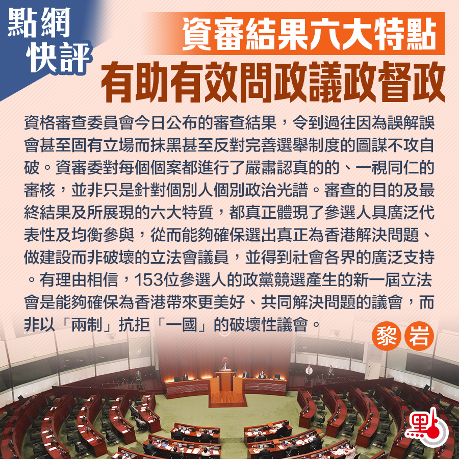 從今日公布的審查結果來看,具有這樣六個明顯的特徵:一是審查完全依照香港選舉法例,不僅僅著重香港國安法的愛國政治標準,也注重本地選舉法例的具體規定。其中參選功能界別醫療衛生界的劉子進,因為是政府僱員,不符合法例,故此沒有參選資格。其二是154名獲提名的參選人中,幾乎全員通過,部分曾被外界擔心會被DQ的參選人亦安全入閘,顯示從中央政府到特區政府,在經歷黑暴撕裂後,社會需要大理解大和解大包容,同心協力向前看,一心一意謀發展。三是經過資格審查後的參選人,來自個各界別,包括爭取連任立法會議員,現任區議員,學術界、商界、專業人士、工會、宗教及工人等,符合均衡參與及廣泛代表性的原則。四是資格審查結果反映資格審查工作並非搞清一色,不論背景的審核標準都完全一致,一視同仁,這也決定了未來的立法會無論選舉結果如何,都必然不會是一言堂。五是資格審查結果即出乎意料之外又在預料之中,資審會對參選人的審查更多的是從務實的角度處理個案,對於部分曾有社會聲音質疑過往是否愛國的參選人,本著多元包容的政治原則,入情入理入法,開閘放人,體現了各界求同存異的多元包容,展現了民主政治的公開公平公正,為立法會日後有效問政議政督政奠定了堅實的社會政治基礎。六是審查結果充分證明了中央完善選舉制度的必要性合理性。經過嚴格審查,參選人在往後參與立法會的立法問政工作中,必須謹守基本法,愛國愛港,依法督政議政。這就為在愛國者治港的大前提下,確保立法會有序運作,從而確保特區政治能夠達致良政善治奠定了堅實的社會政治基礎。