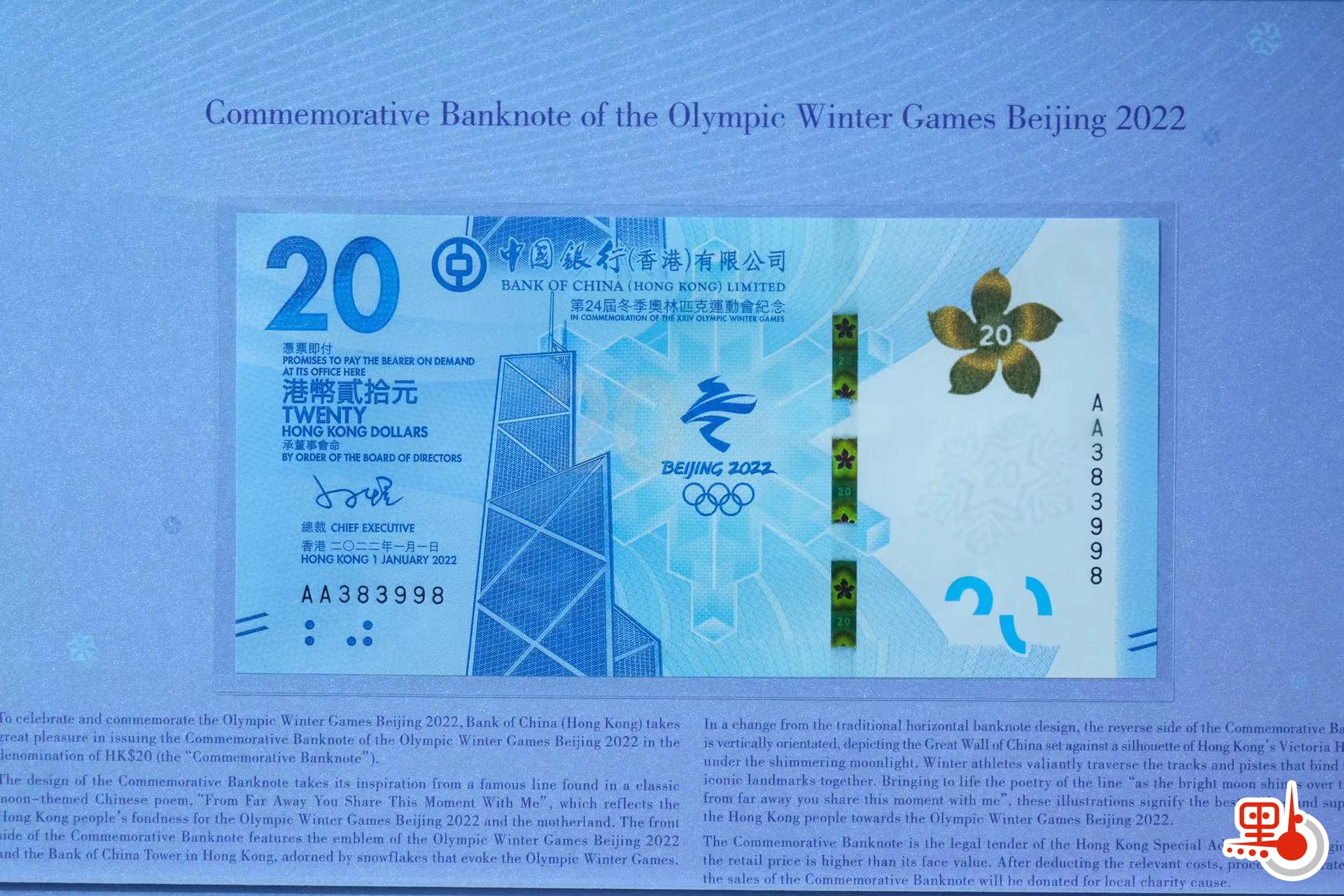 2022年北京冬奧會將於明年2月4日開幕,中銀香港今日(24日)在香港和北京兩地舉行「北京2022年冬奧會紀念鈔票」發行儀式,將發行200萬張20元面值的紀念鈔票,將於12月1日至10日接受認購申請,可於分行及網上認購,淨收益將全部捐贈作本地公益慈善用途。