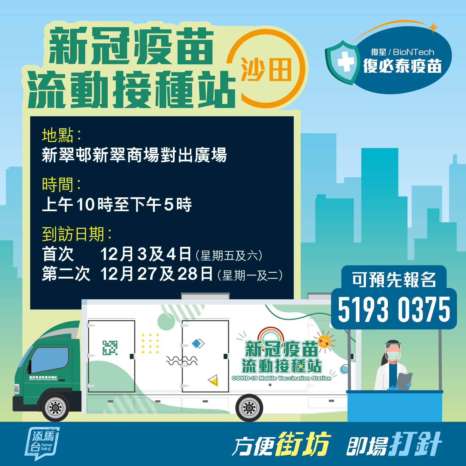 政府今日(2日)在社交專頁「添馬台」發文,指新冠疫苗流動接種車明日 (3日) 正式出動,第一站將到沙田新翠邨,提供復必泰疫苗接種。無論要打第一、第二或第三針都可以,呼籲街坊們尤其是長者和長期病患者快把握機會。