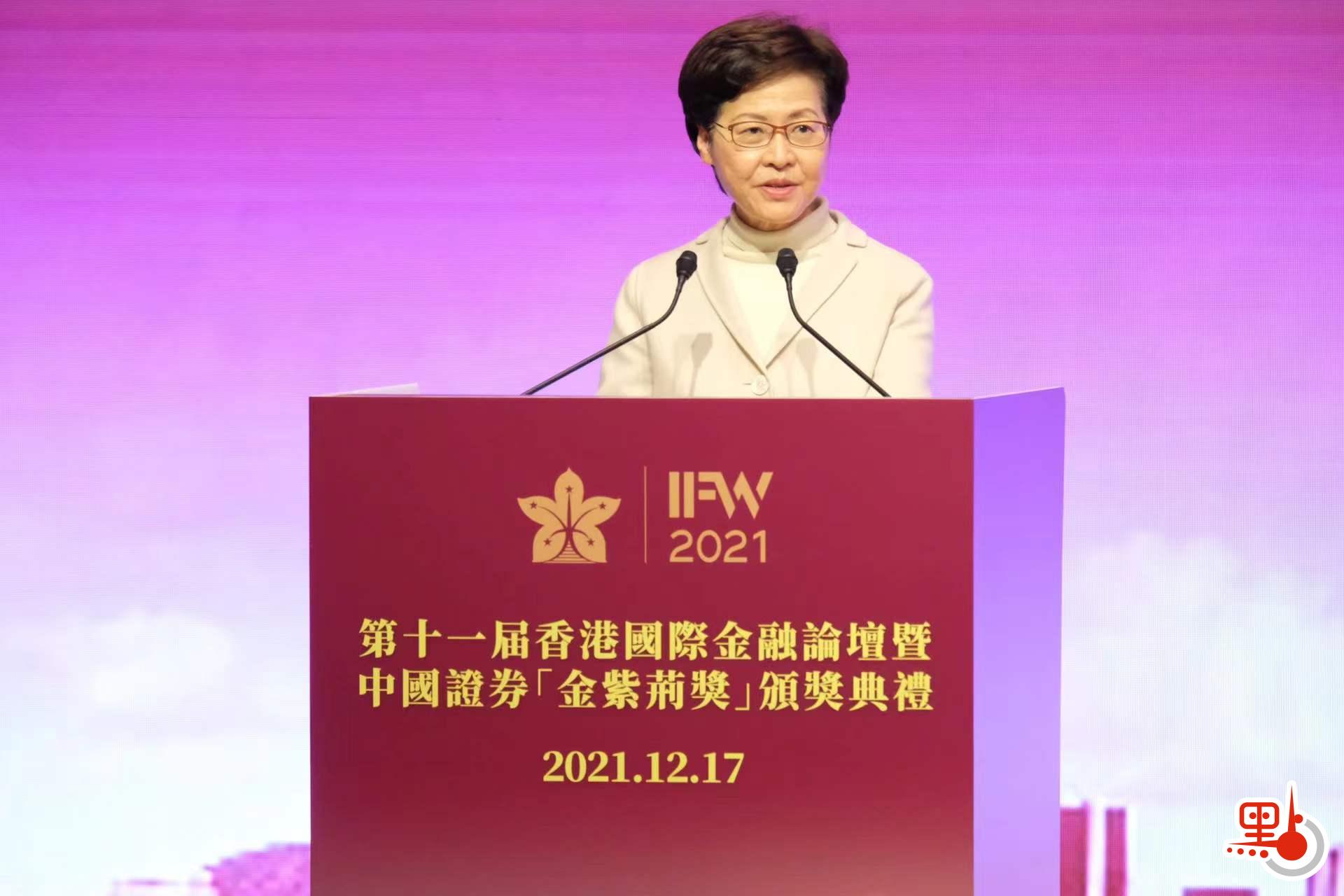 金融界一年一度的盛事、「2021第十一屆香港國際金融論壇暨中國證券『金紫荊獎』」頒獎典禮於今日(17日)下午在香港會議展覽中心舉行。香港特區行政長官林鄭月娥、外交部駐港公署副特派員潘雲東、香港特區政府財經事務及庫務局局長許正宇、全國政協常委吳良好等約250位嘉賓出席今次活動。行政長官林鄭月娥,全國政協委員、香港大公文匯傳媒集團董事長姜在忠等發表致辭。