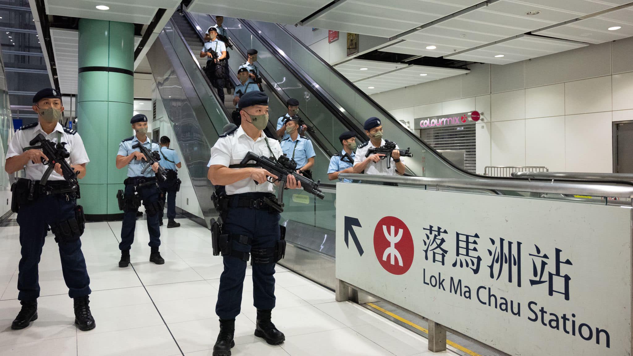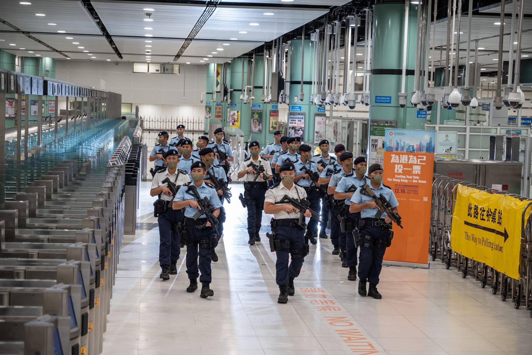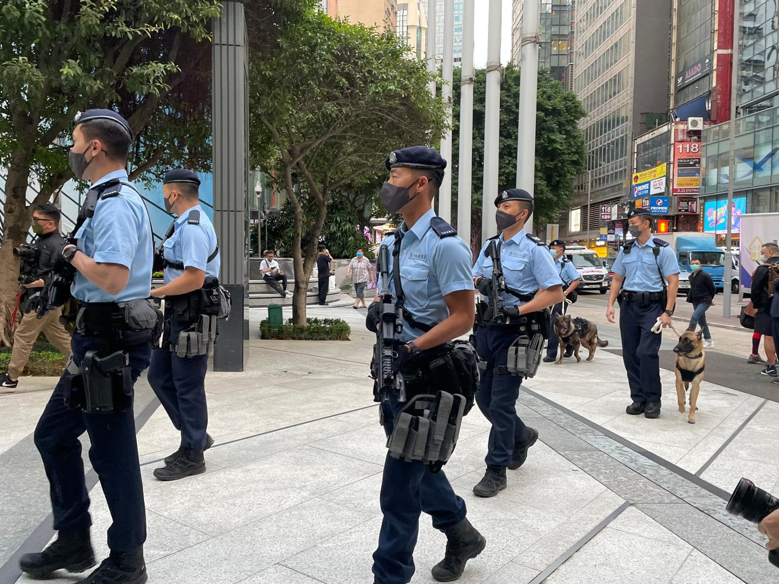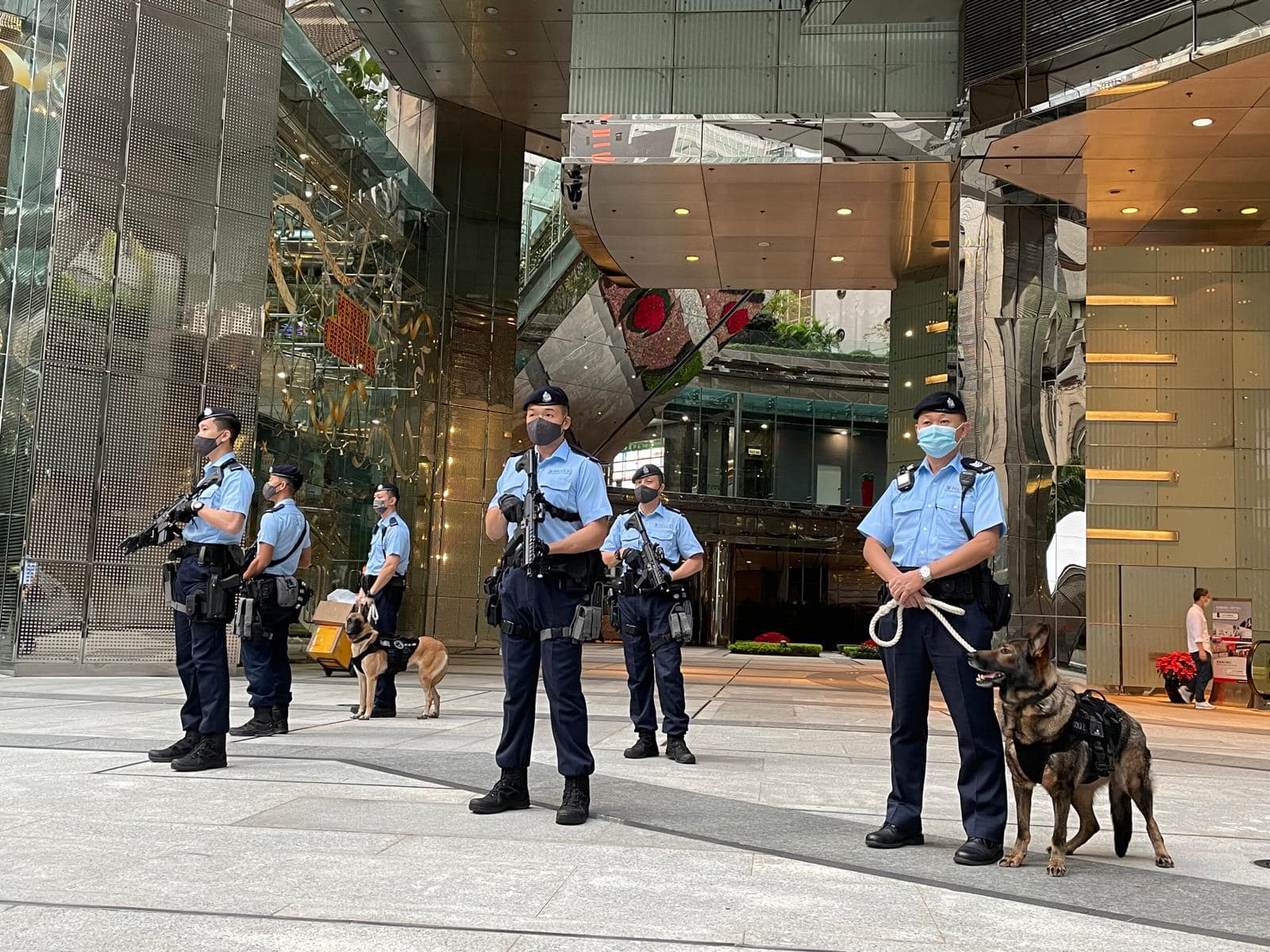 其中在中環中心、九龍公園及調景嶺的投票站外,下午至入夜時分均有大隊軍裝警員在場戒備。他們帶同警犬,並配備衝鋒槍,在票站內外來回巡視。