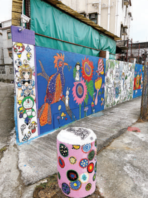 壁畫又融合日本藝術家村上隆標誌性的太陽花、草間彌生的圓點花紋、抽象的禪繞圖案等元素的畫作,日本藝術風甚濃,吸引不少遊人前往打卡。當天記者於現場觀察,有不少牆壁上只是「起稿」了,想必日後會有更多不同的壁畫面世。