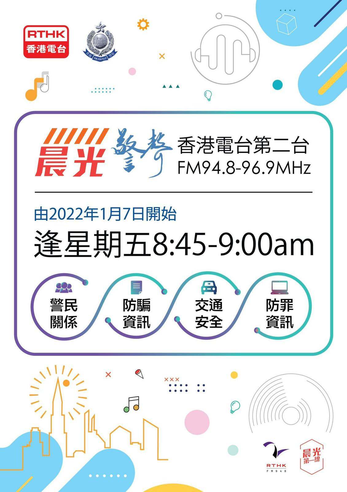香港電台第二台有全新節目上線,自本周五(7日)起,將與警隊攜手推出《晨光警聲》,用輕鬆手法為市民送上警民關係訊息、防騙資訊、交通安全以及防罪資訊。