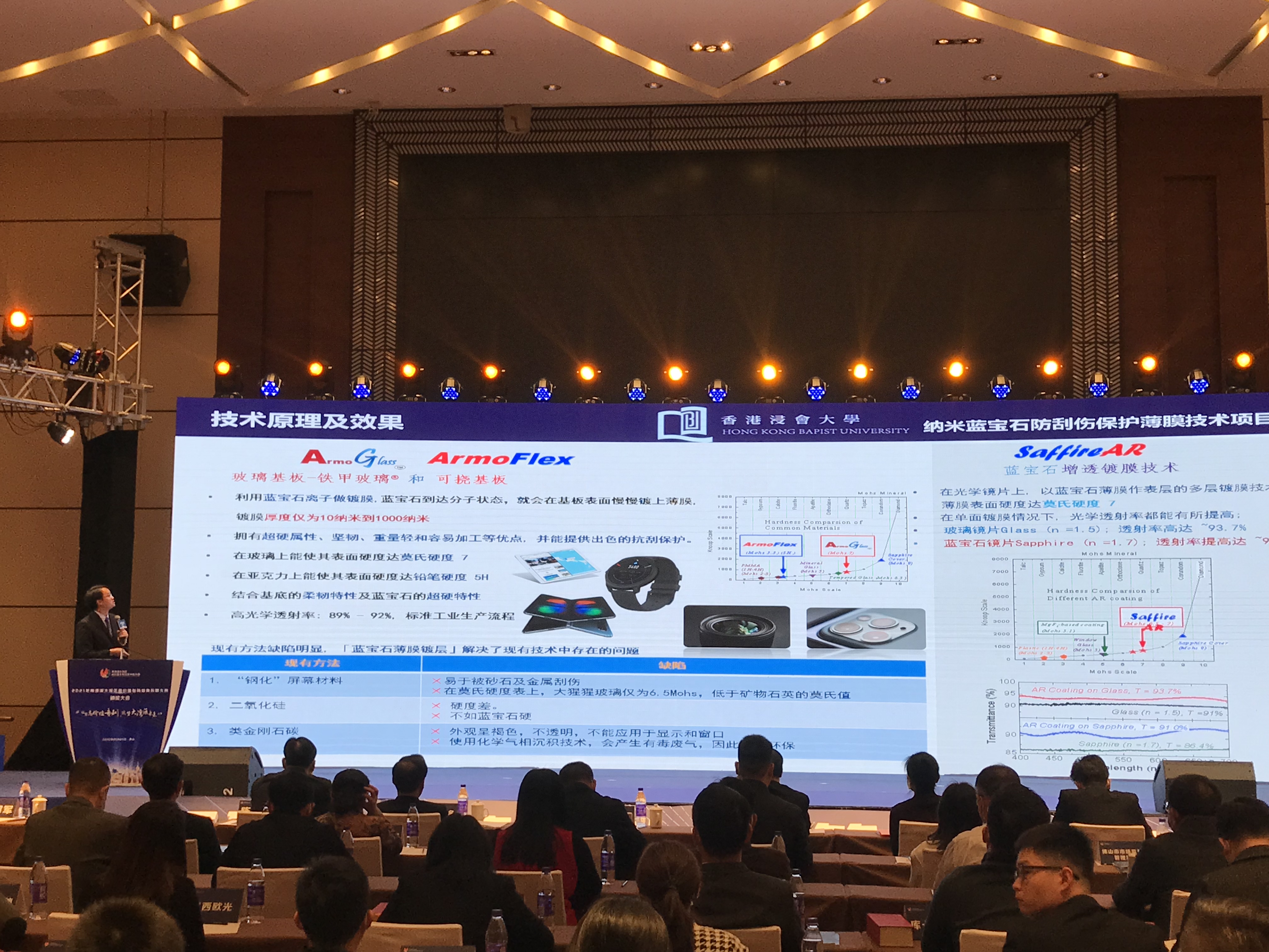 而香港浸會大學的「納米藍寶石防刮傷保護膜技術」項目,自主研發出一種稱為「鐵甲玻璃」的超硬透明藍寶石膜技術,其產品藍寶石薄膜擁有超硬屬性、堅韌、重量輕、低成本和易加工等優點,能普及至所有電子設備的玻璃面板。
