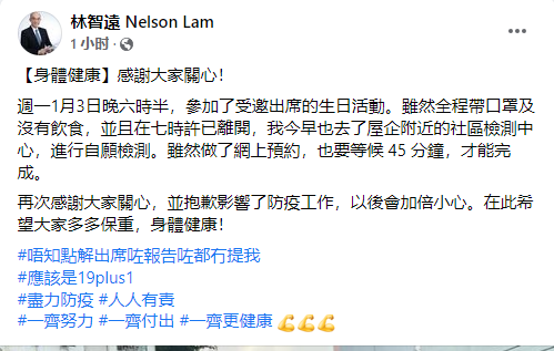 林智遠指,自己周一(3日)晚約6時半出席生日活動,全程戴口罩沒有飲食,並在7時許已離開。他為影響防疫工作致歉,表示以後會加倍小心。林智遠在回覆留言時表示自己很可能會被送往檢疫中心,但目前仍未有消息。