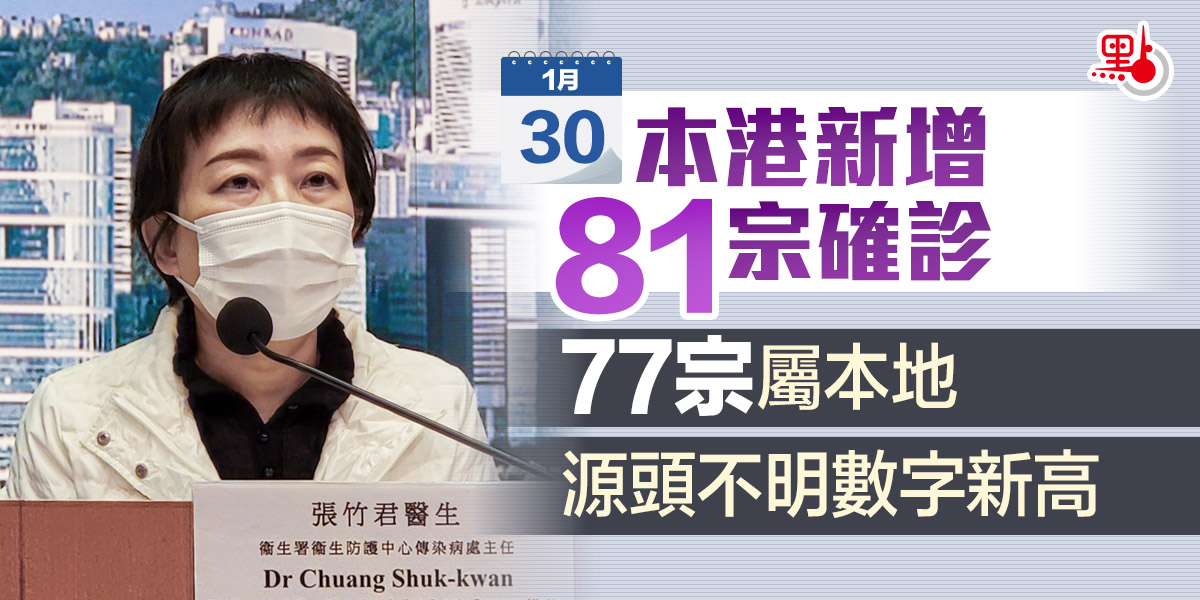 本港疫情仍舊嚴峻,衞生防護中心傳染病處主任張竹君今日(30日)下午在疫情記者會上公布,截至今日零時,本港新增81宗新冠病毒個案,乃8日來首次回落至100宗以下。77宗屬本地個案,9宗懷疑攜帶Delta變異病毒株,另外有15宗源頭不明。其中,源頭不明個案創新高。