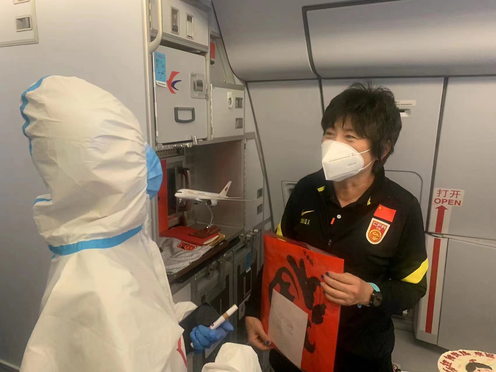 「踏入東航客艙,就像提前回到了祖國的懷抱」。為了讓女足姑娘們「補過」好春節,東航乘務組在客艙裏貼上家人看球時題寫的福字和春聯,營造濃厚的節日氛圍。自接到包機任務後,東航及時制定了周密的保障計劃,快速完成航權申請。東航新德里營業部在孟買機場特別設置專屬快速值機櫃枱,安排專門候機區,安排專人引導全流程登機服務及防疫信息的填報。東航航班承載全國人民的期盼與喜悅,迎接亞洲女足冠軍帶着獎盃勝利歸來。