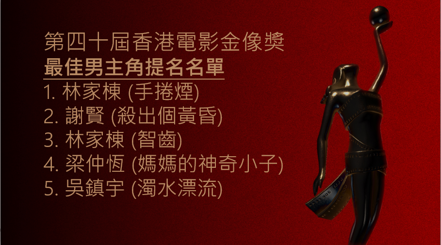 第40屆香港電影金像獎提名名單今日(16日)揭曉,林家棟、謝賢、梁仲恆、吳鎮宇提名最佳男主角,周秀娜、王丹妮、劉雅瑟、吳君如、鞏俐提名最佳女主角,《怒火》《梅艷芳》《媽媽的神奇小子》《智齒》《濁水漂流》競逐最佳電影。《智齒》獲14項提名,《梅艷芳》獲12項提名,《濁水漂流》獲11項提名領跑。