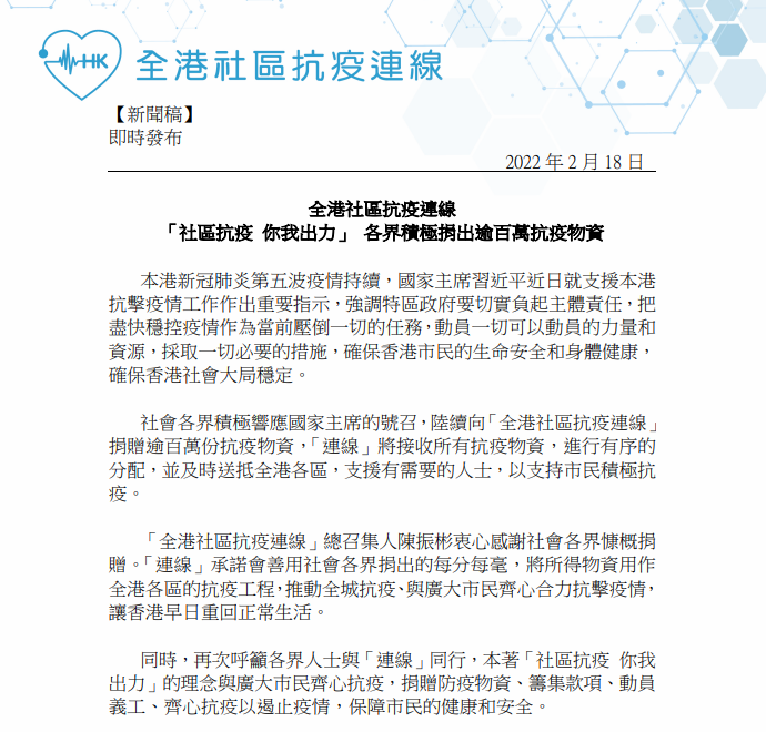 本港新冠肺炎第五波疫情持續,國家主席習近平近日就支援本港抗擊疫情工作作出重要指示,強調特區政府要切實負起主體責任,把盡快穩控疫情作為當前壓倒一切的任務。「全港社區抗疫連線」今日(18日)表示,社會各界積極響應國家主席的號召,陸續向「全港社區抗疫連線」捐贈逾百萬份抗疫物資。