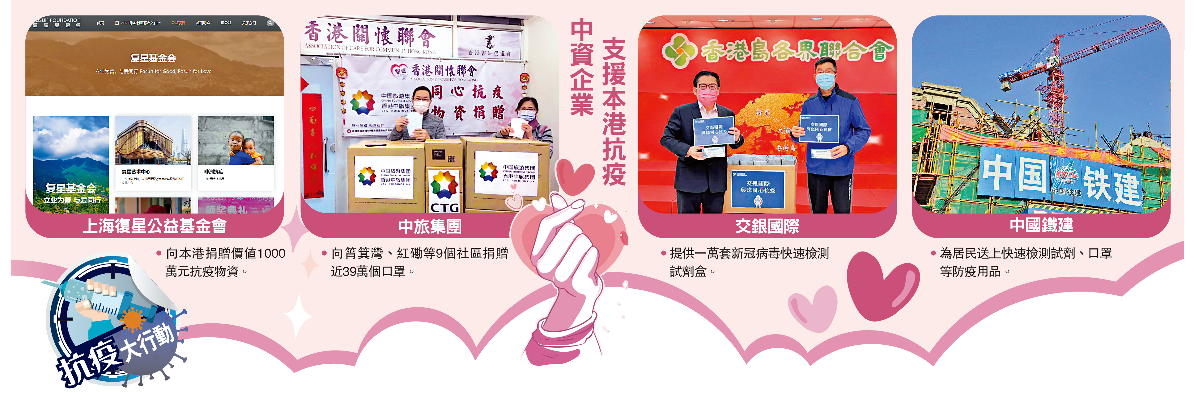香港疫情嚴峻,確診數字連日創疫情新高。為支援香港抗疫,商界相繼伸出援手。上海復星公益基金會(簡稱:復星基金會)昨天(19日)宣布,向香港捐贈價值1000萬元的抗疫物資,包括快速抗原檢測包、醫用口罩等。同時,交銀國際昨日將一萬套新冠病毒快速檢測試劑盒,送至港九、新界的基層社團和街坊組織。