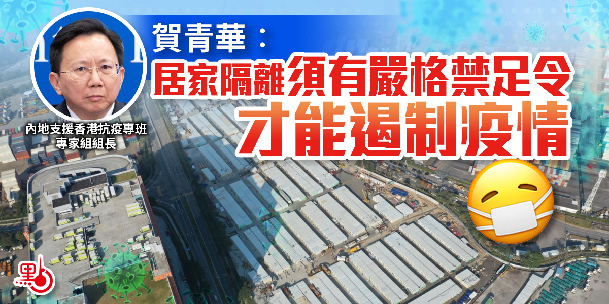 本港現時隔離設施不足,大量確診者變相要居家隔離,賀青華認為要成功遏制疫情,居家隔離必須嚴格禁足。他表示控制傳染源、切斷傳播途徑、保護已經感染的人群,是傳染病防控工作的三大法寶,已經確診的陽性感染者,如果居家隔離,這是一個最大的風險。有些陽性的感染者因為症狀不清,以為沒有甚麼太多問題,自己以為沒有事情了,就出去,出去就比較亂,這是一個問題的根本,所以居家隔離一定要嚴格執行禁足令,才能夠從根本上把傳染源控制住。