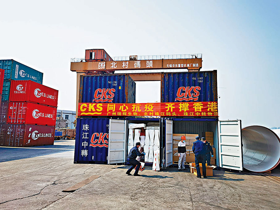 香港此輪疫情嚴峻,在關鍵時刻,珠三角各地的防疫物資一刻不停地從各地運輸到香港,支援香港抗疫。3日,載有10萬人份的新冠病毒快速測試包等抗疫物資的船舶順利從佛山市南海區北村碼頭口岸出境前往香港。香港文匯報記者從當地政府部門獲悉,自香港爆發第五波疫情至今,該航線合計已快速運輸了40噸防疫醫藥用品、隔離設施用品等抗疫物資到香港。
