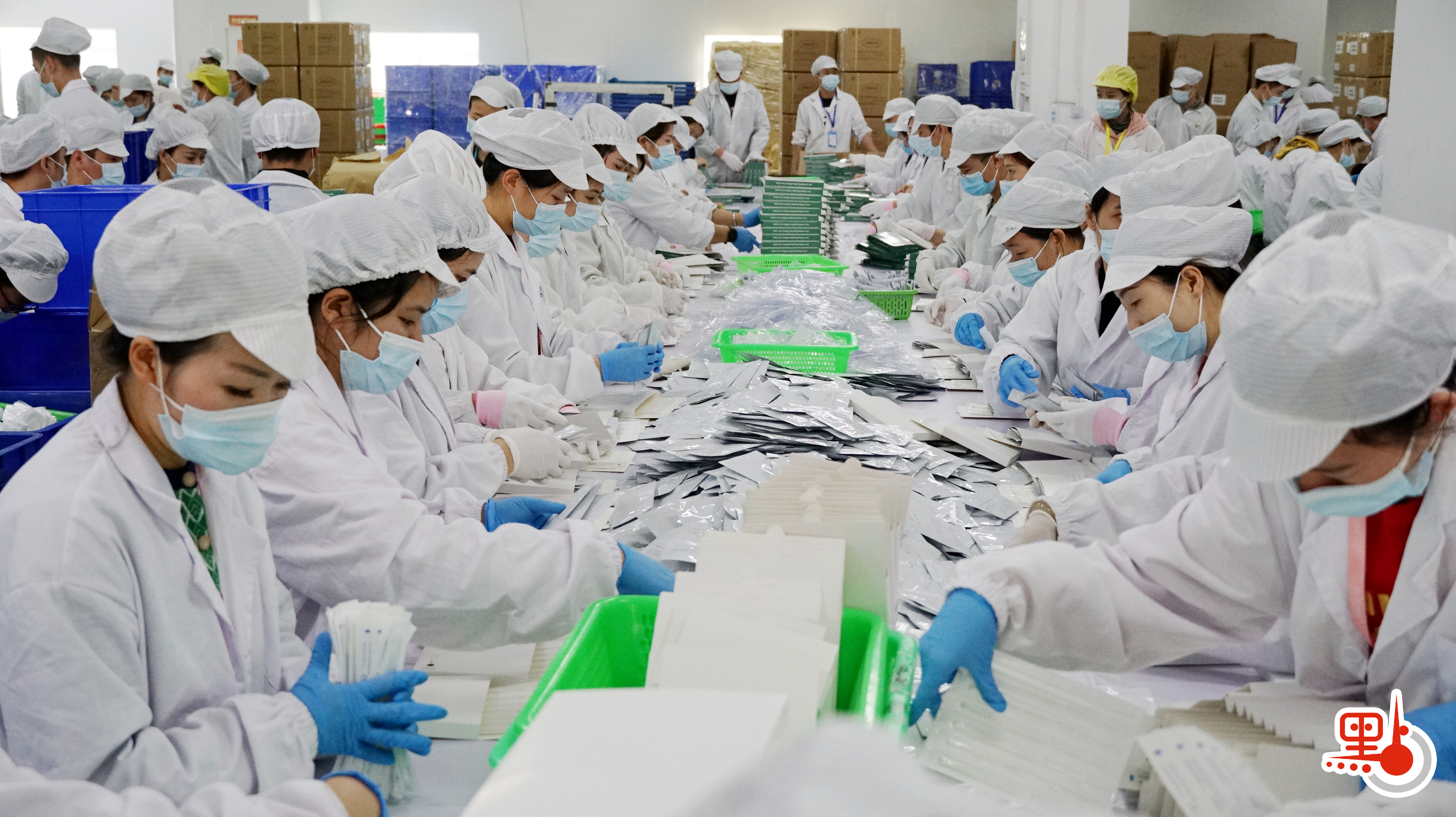 在寶太生物生產車間,記者看到,戴着2層口罩和手套的工人,正熟練而快速地把檢測試劑裝盒、封箱、打包,轉運至大貨櫃車上。工作人員告訴記者,數日前工廠即開始準備今次捐贈物資,這兩日都在加班生產,希望早日將物資送到香港同胞手中。
